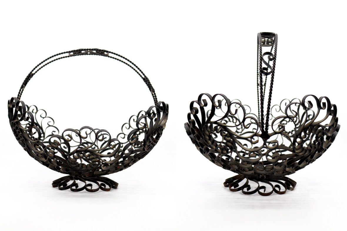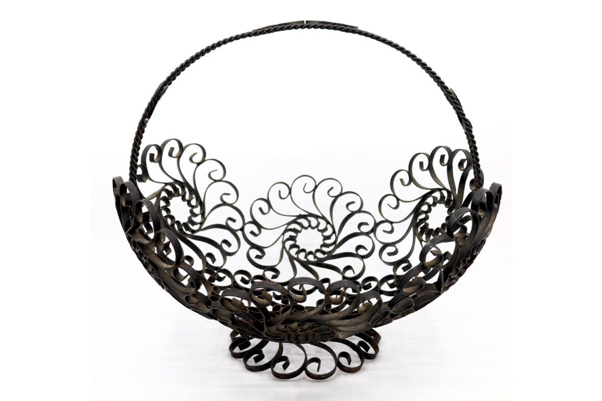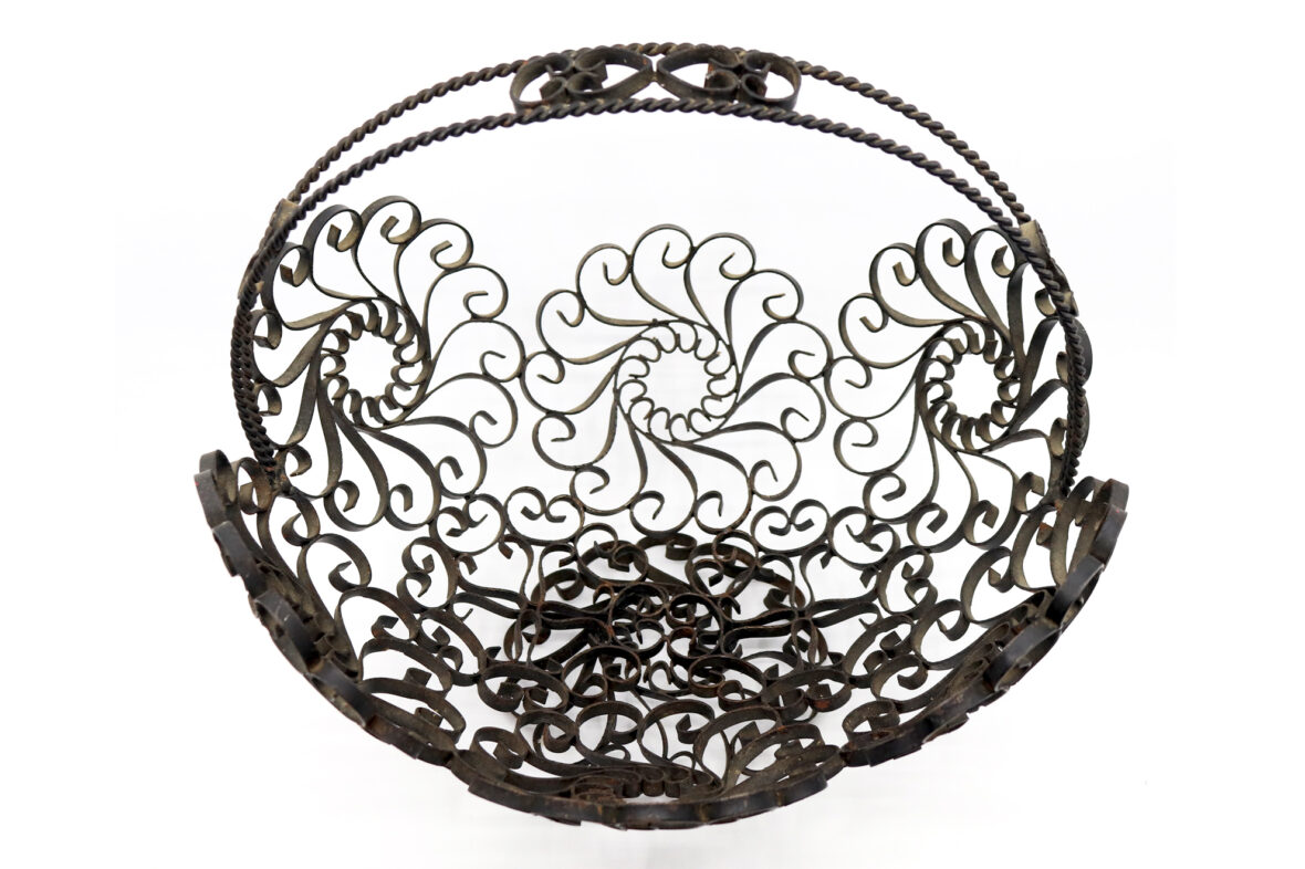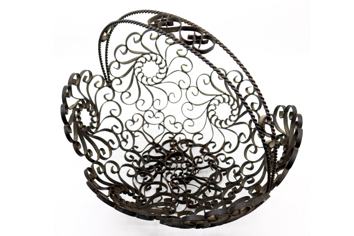 Plateau en fer forgé, attaches en métal doré et verre à décor d’enroulements.