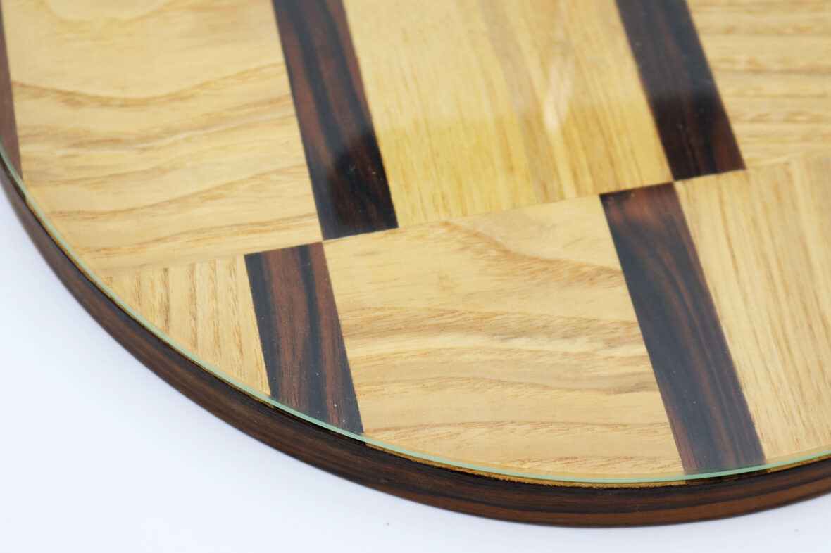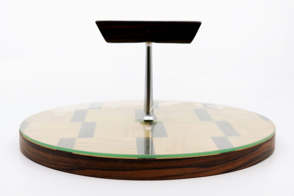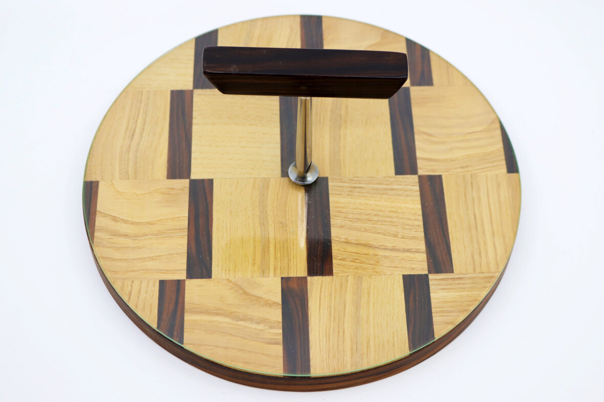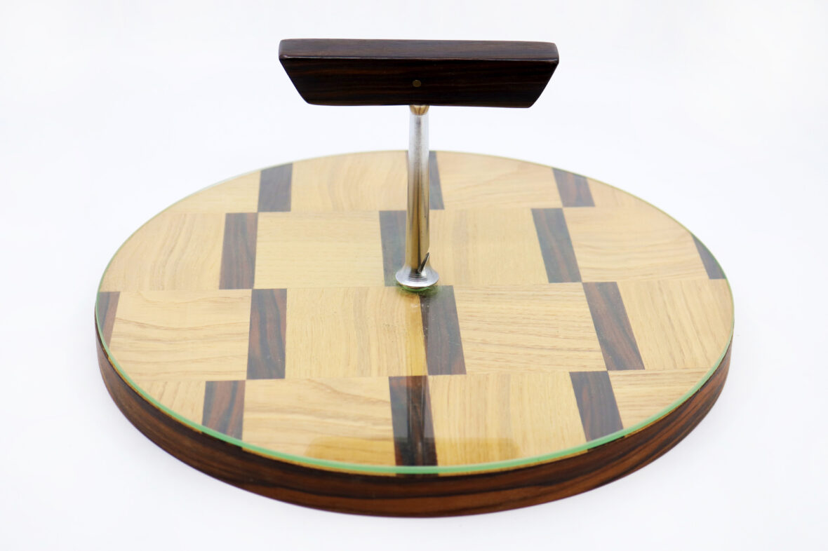Présentoir à fromages en bois et placage de bois exotiques, la poignée en ébène de Macassar. Circa 1970/1980.