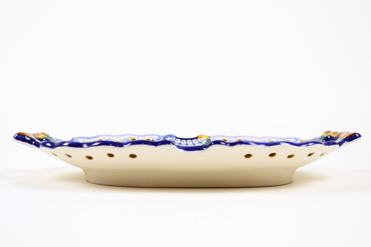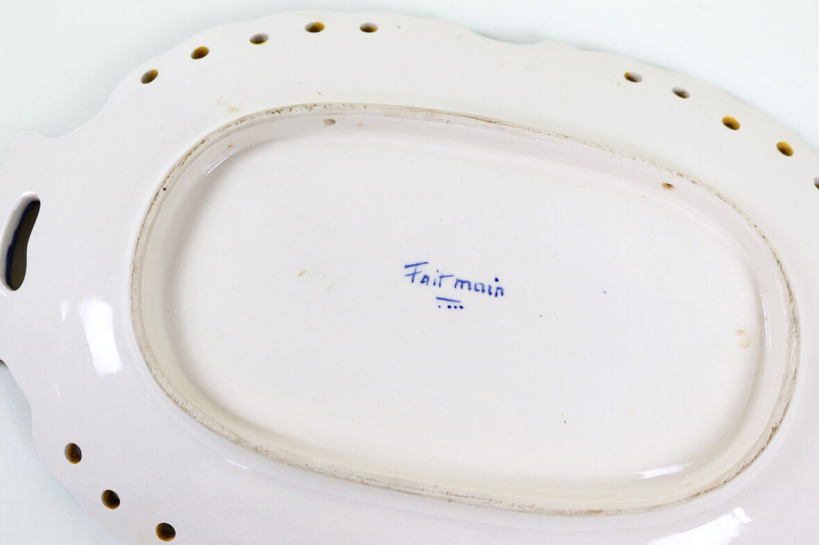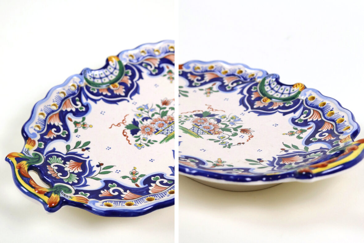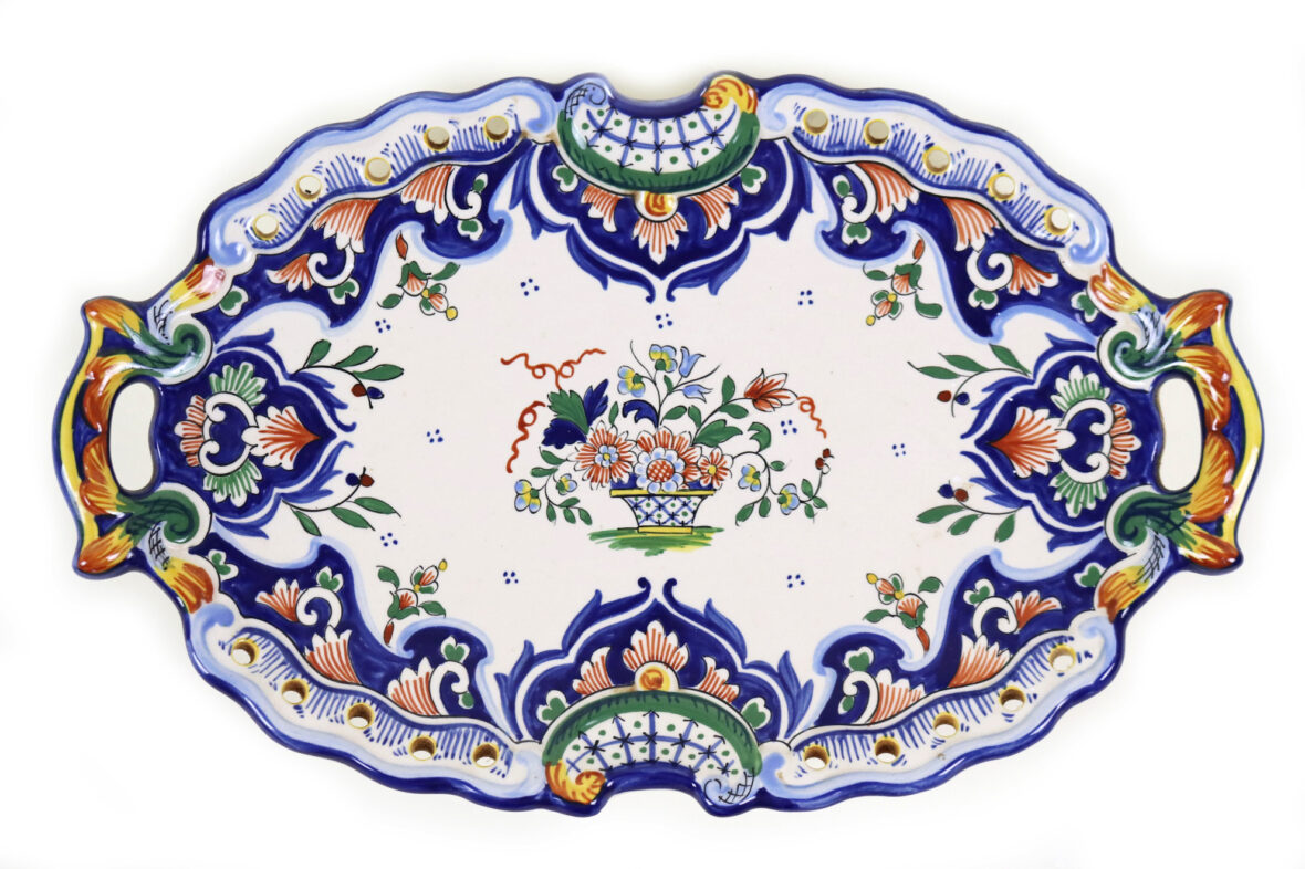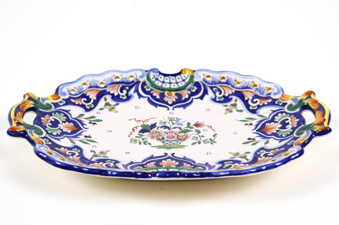 Plat en faïence à deux anses et bords contournés, décor de lambrequins et agrafes sur l’aile, un panier fleuri au centre.