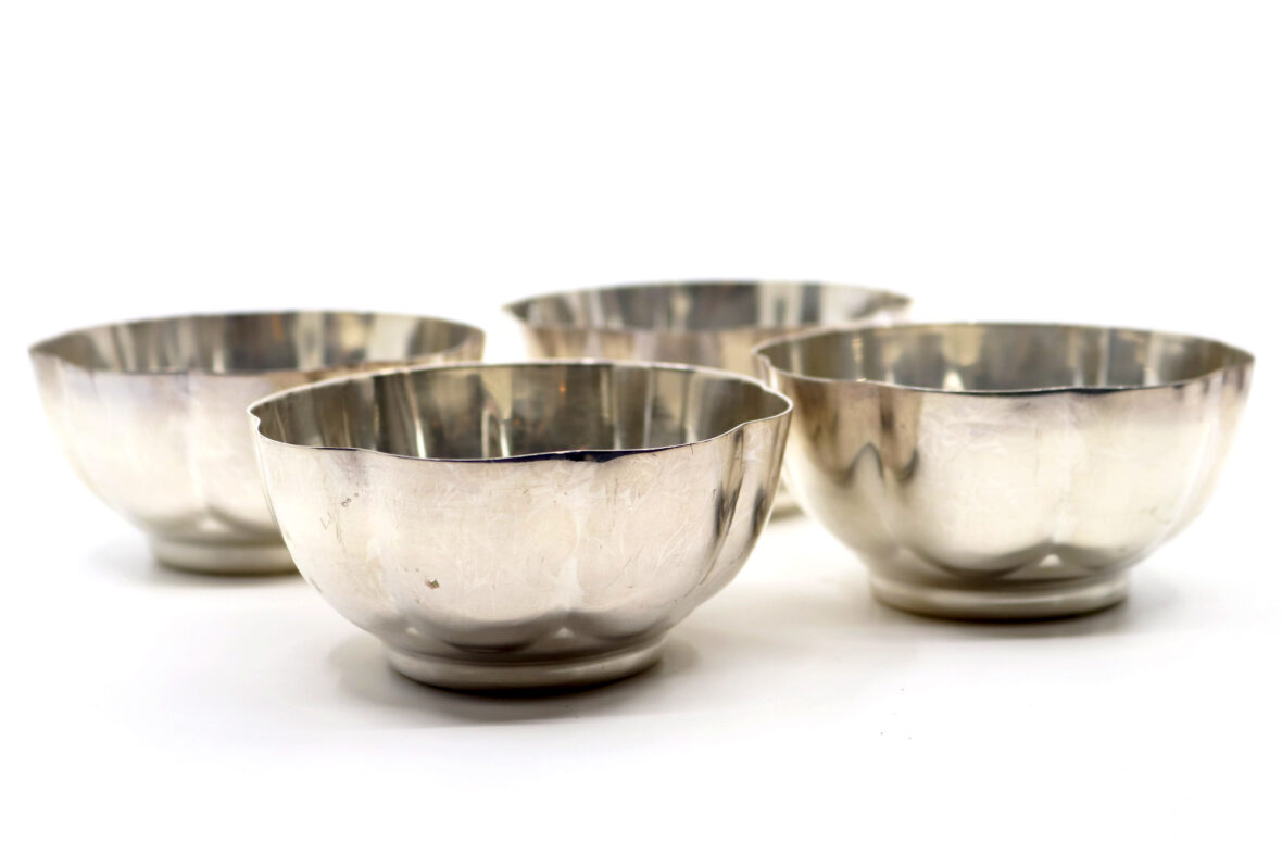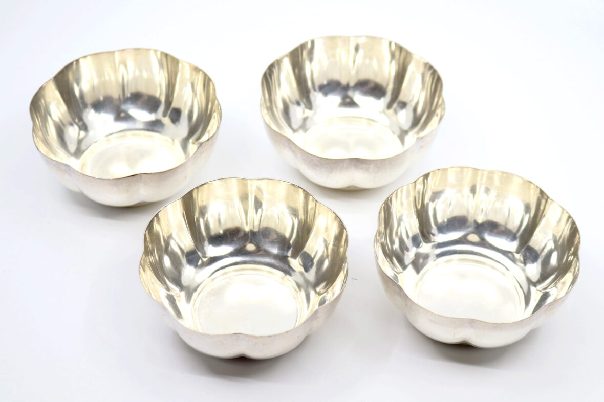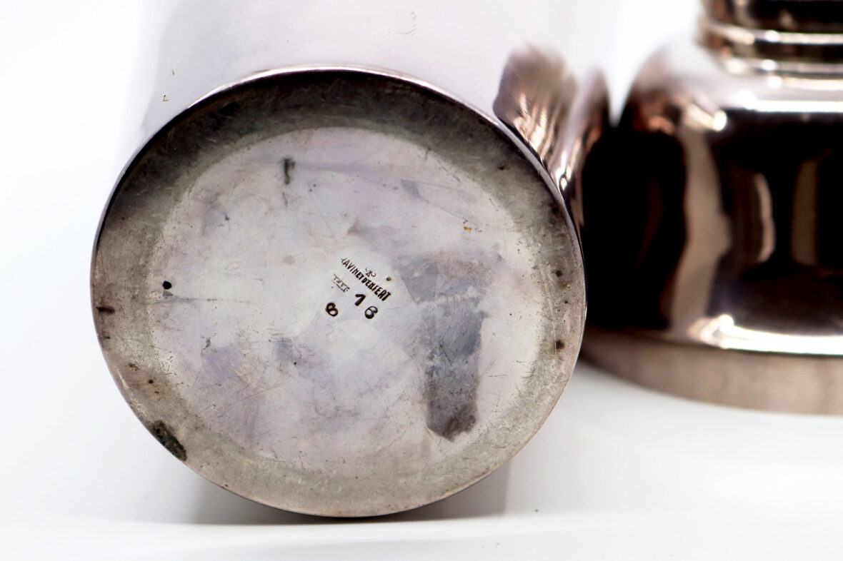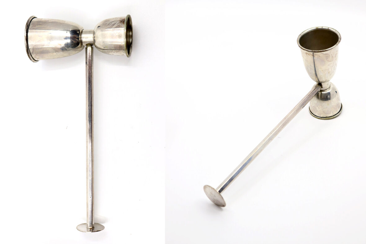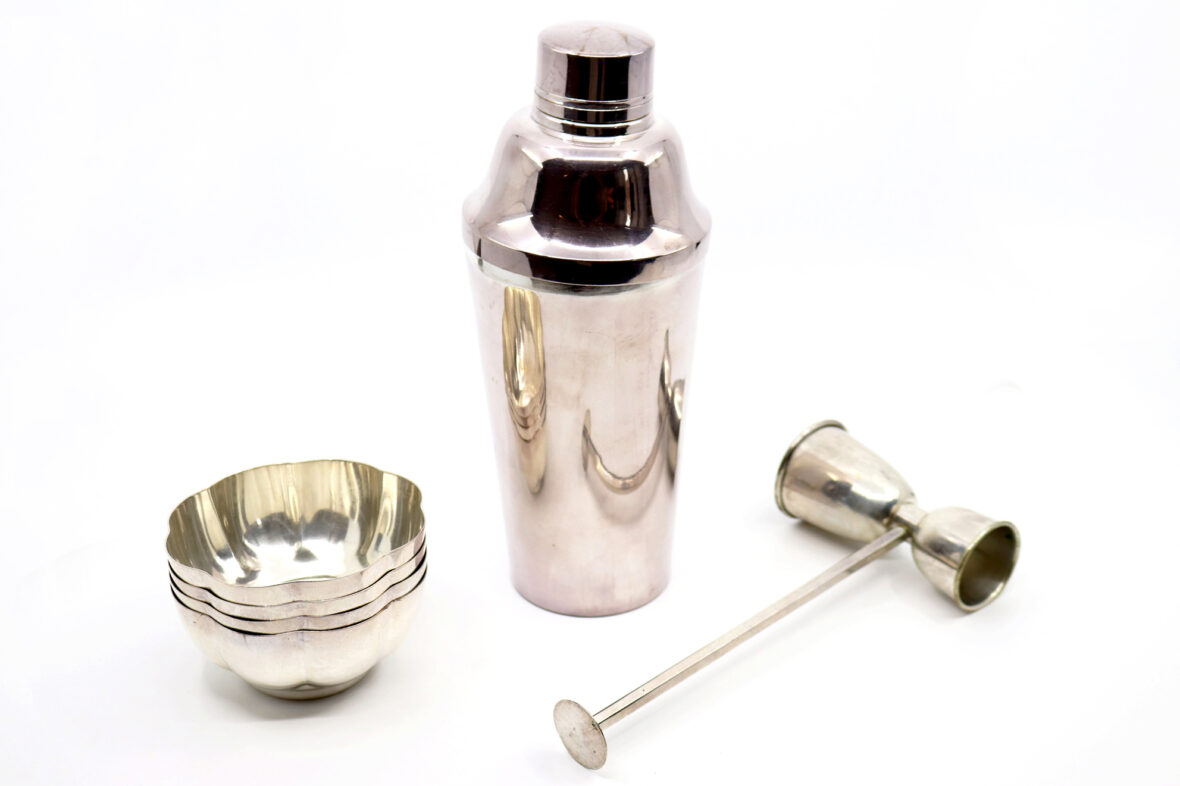 On y joint un doseur à cocktail et quatre coupelles en métal argenté.
