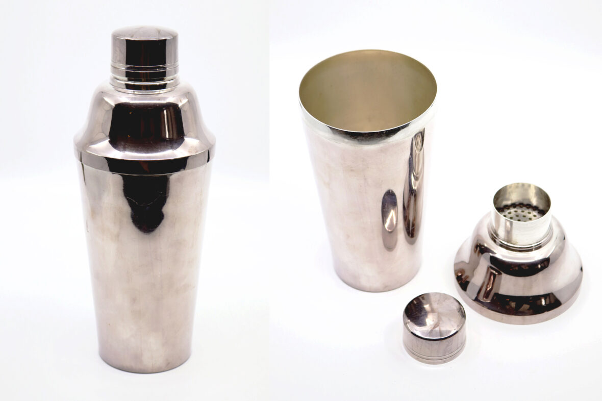 Shaker à cocktail en métal argenté.