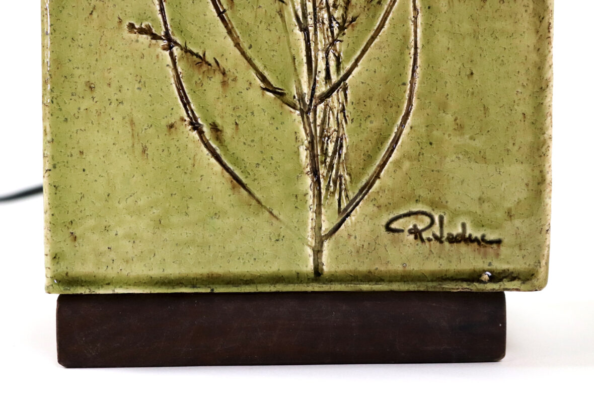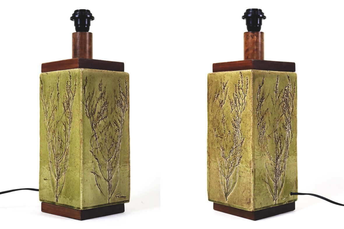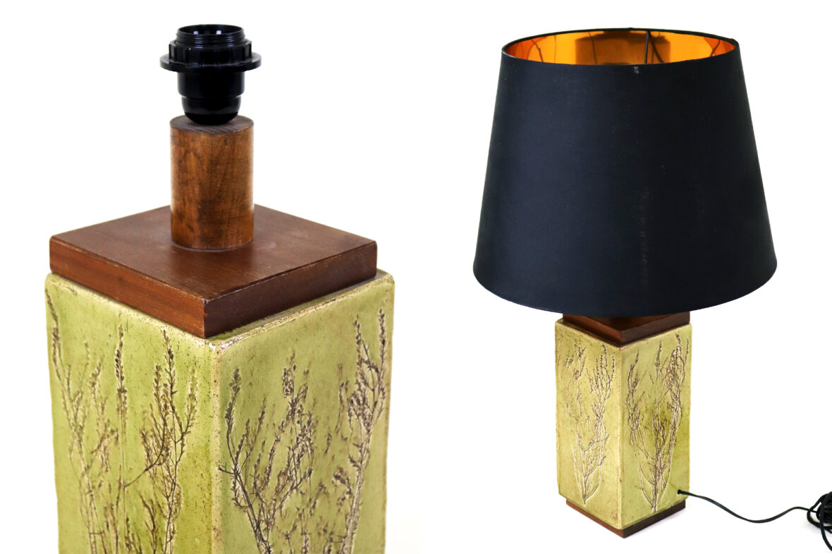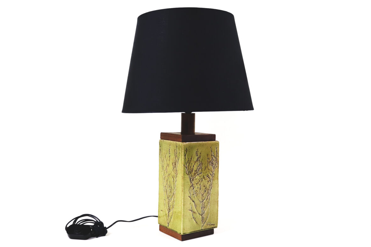 Pied de lampe à section carrée en bois et grès émaillé à décor de branchages. Signé en bas.