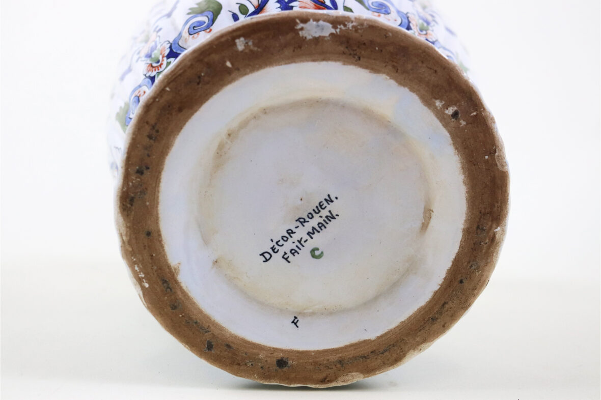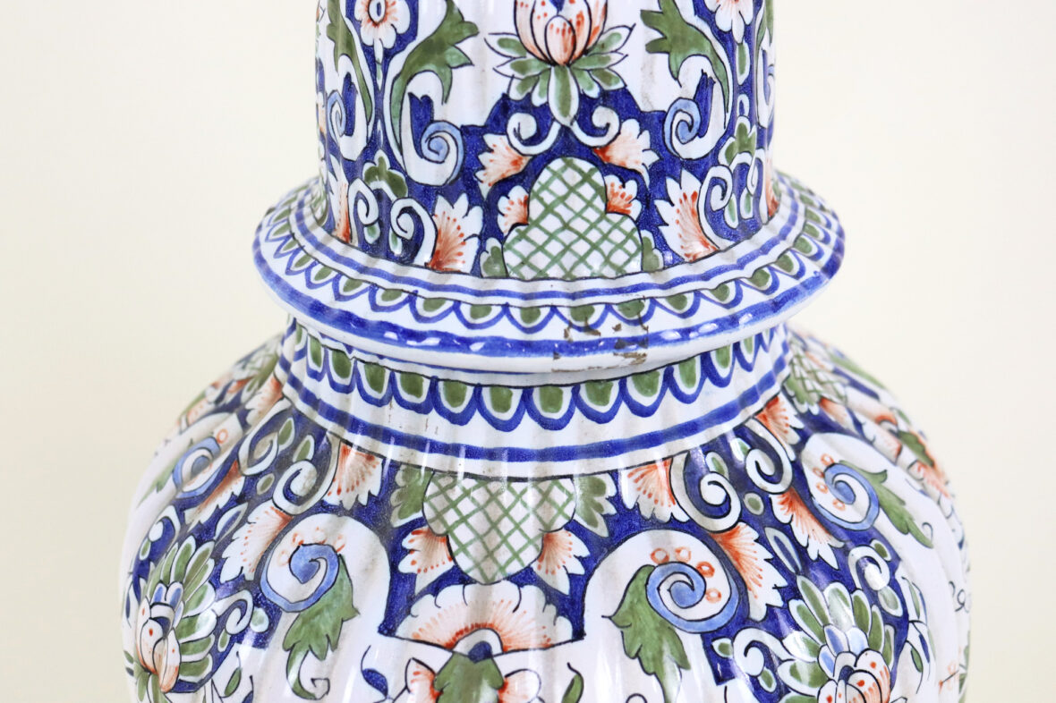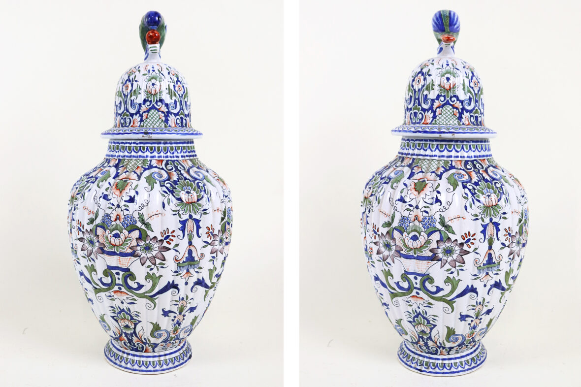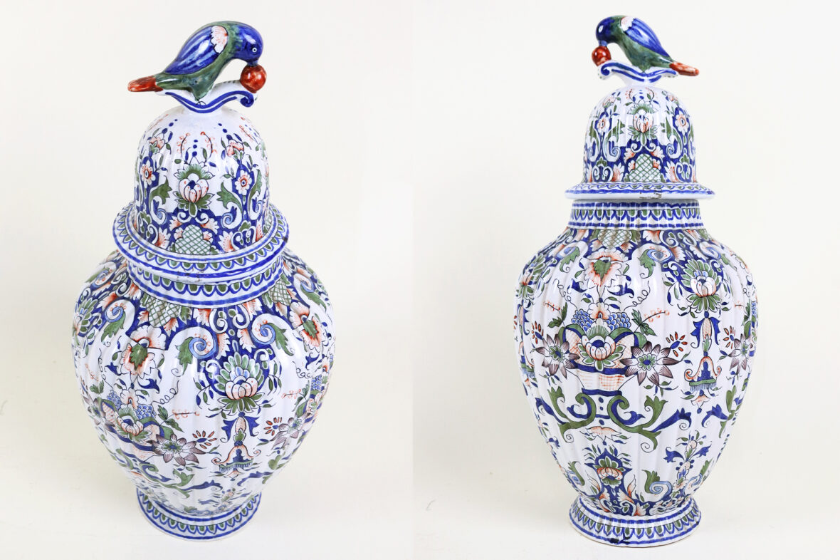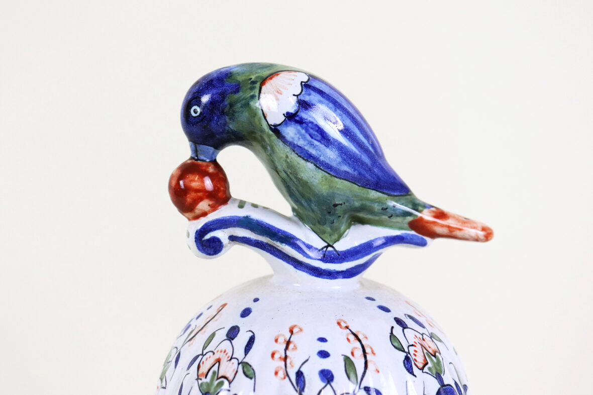 Potiche couverte en faïence à décor polychrome de lambrequins, vasques fleuries et rinceaux feuillagés, le frétel en forme d’oiseau tenant une graine dans le bec.