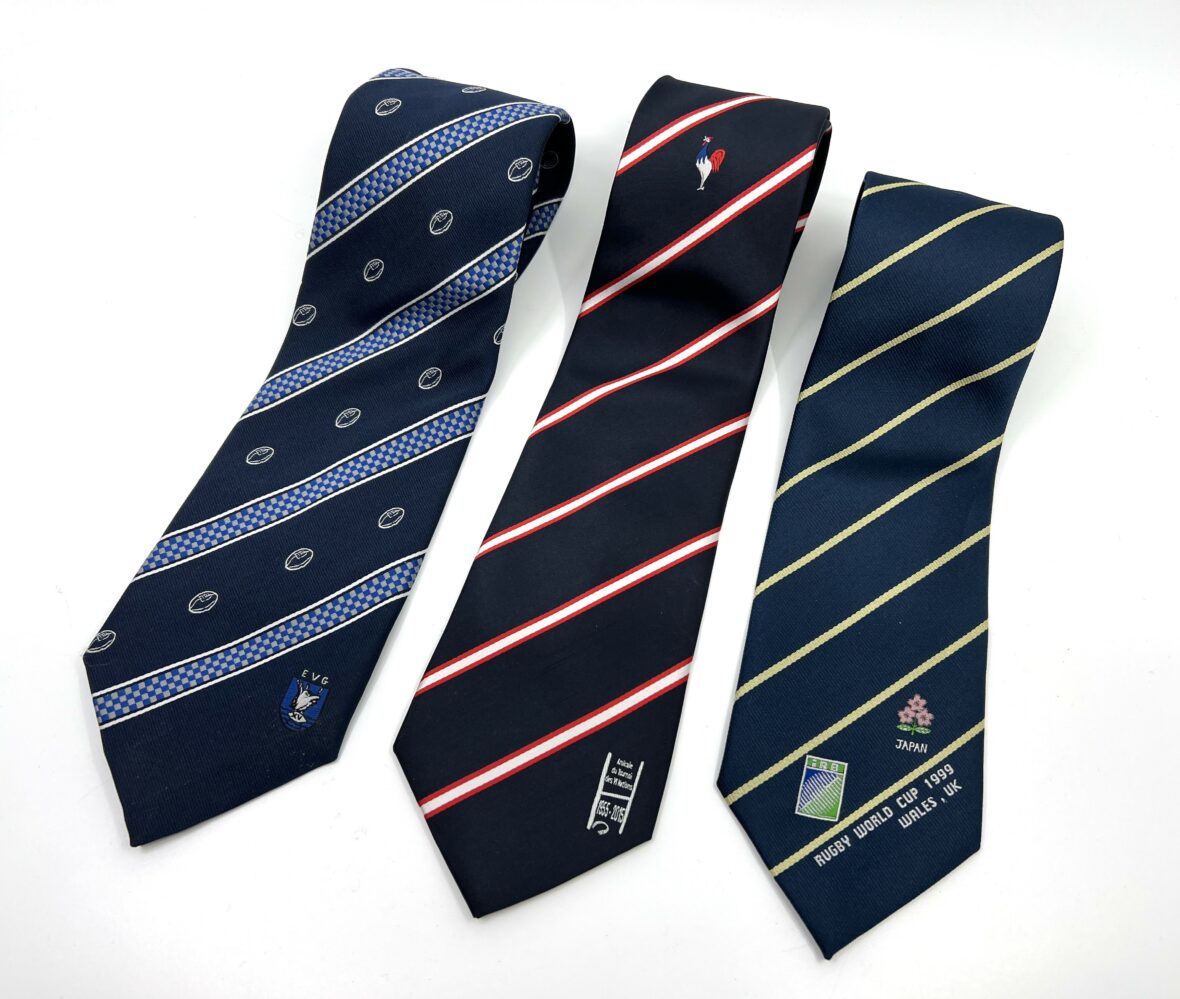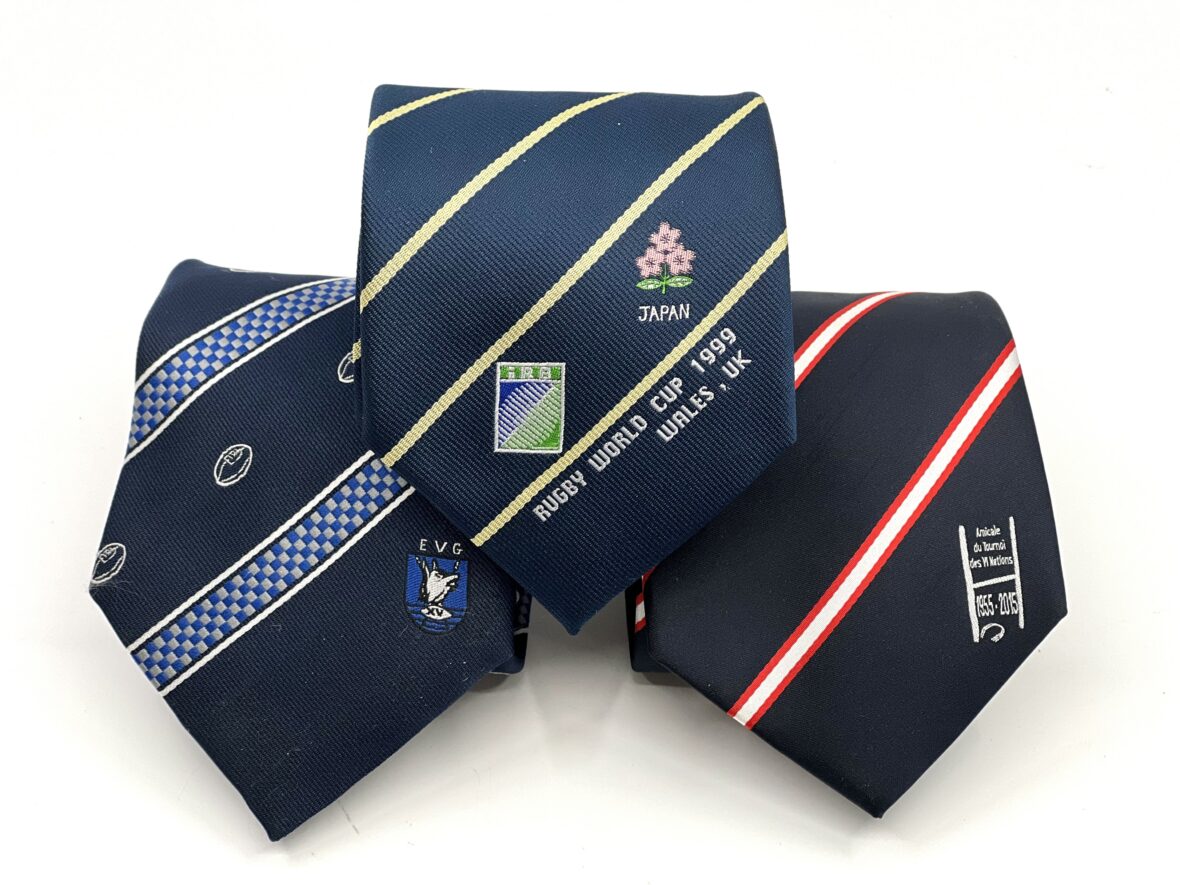 RUGBY – Ensemble de trois cravates dont Coupe du Monde Japon 1999 (Wales) et Amicale Tournoi des VI Nations 1955-2015 (France).