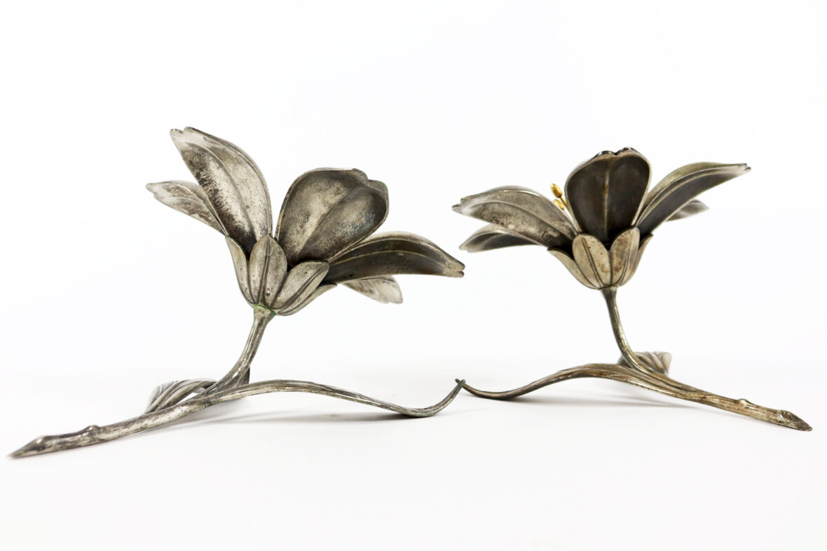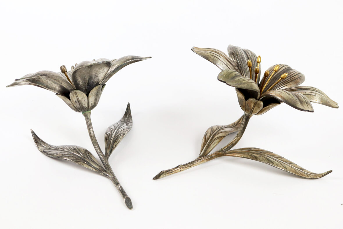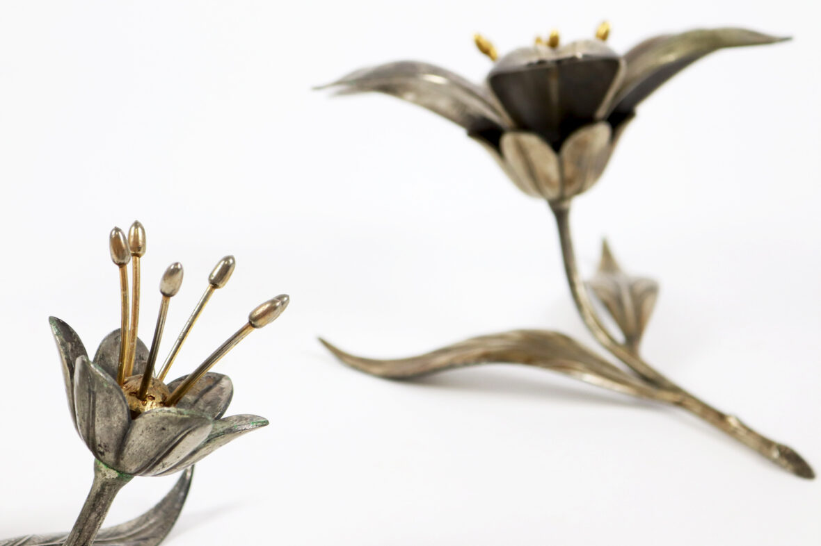 Paire de cendriers en bronze argenté et doré stylisant des fleurs, les cendriers dans les pétales se détachant.