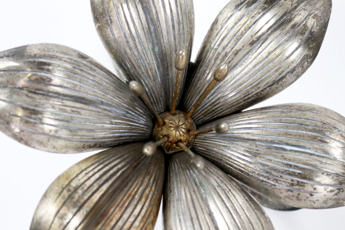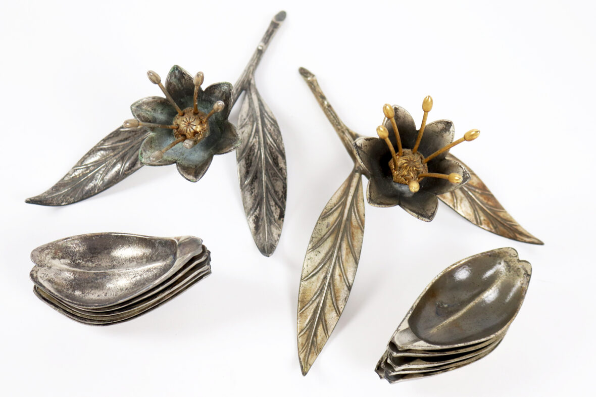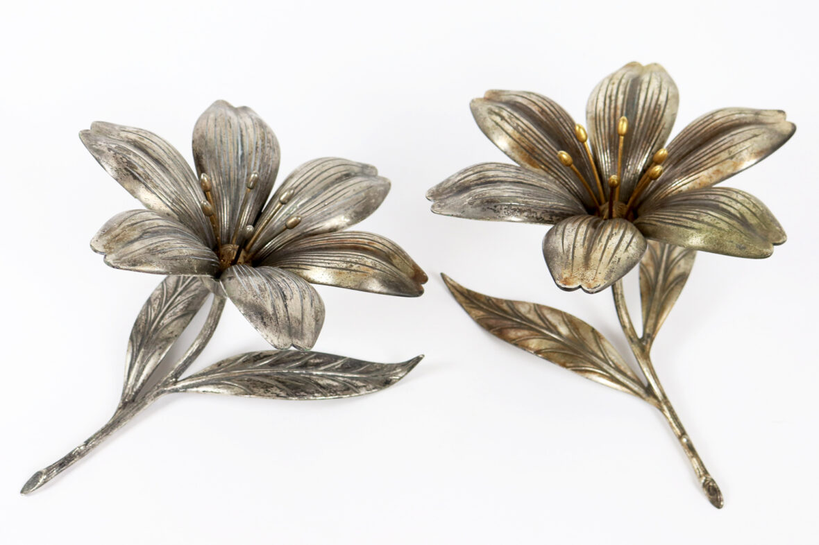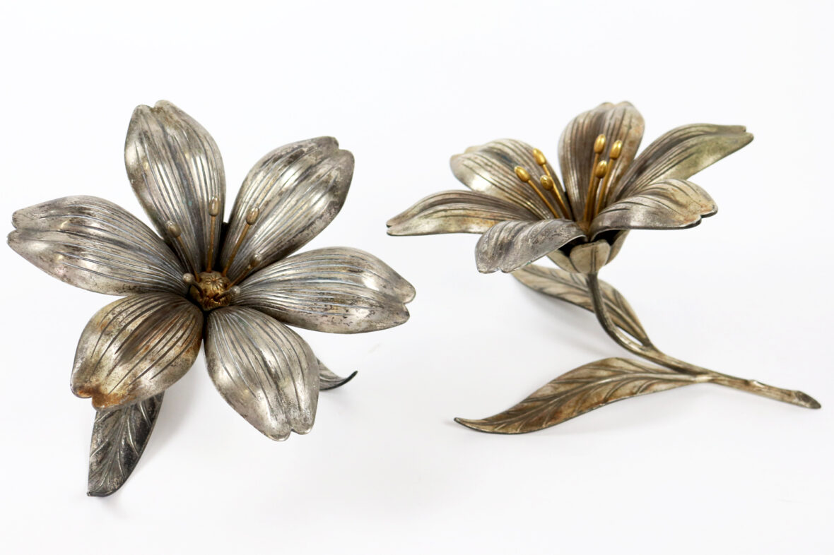 Paire de cendriers en bronze argenté et doré stylisant des fleurs, les cendriers dans les pétales se détachant.