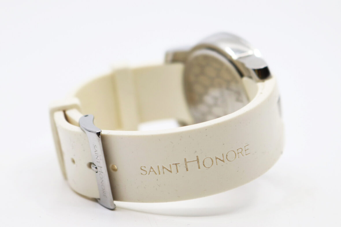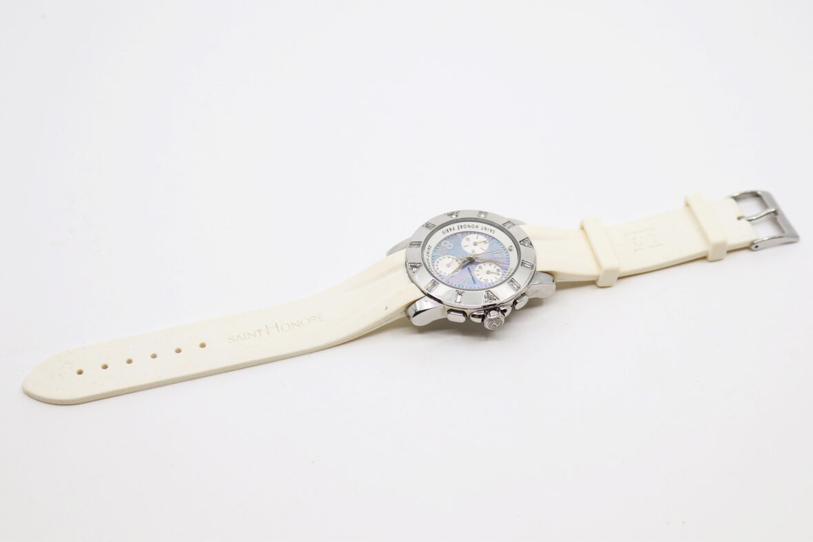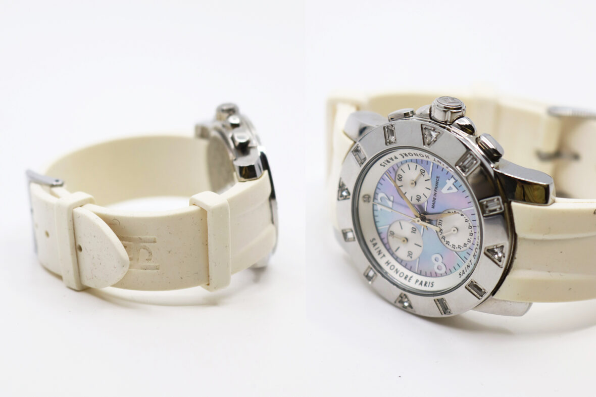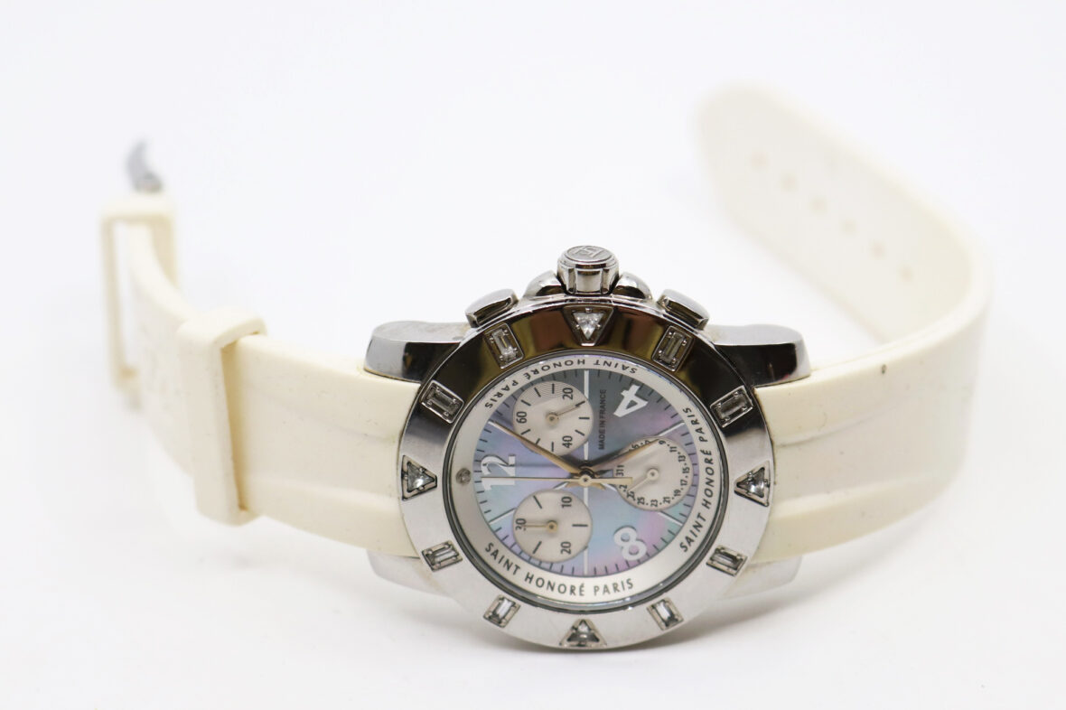 Montre chronographe en acier, la lunette sertie de pierres blanches, bracelet en silicone blanc.