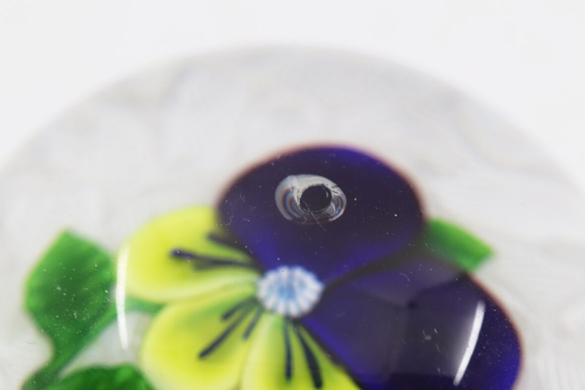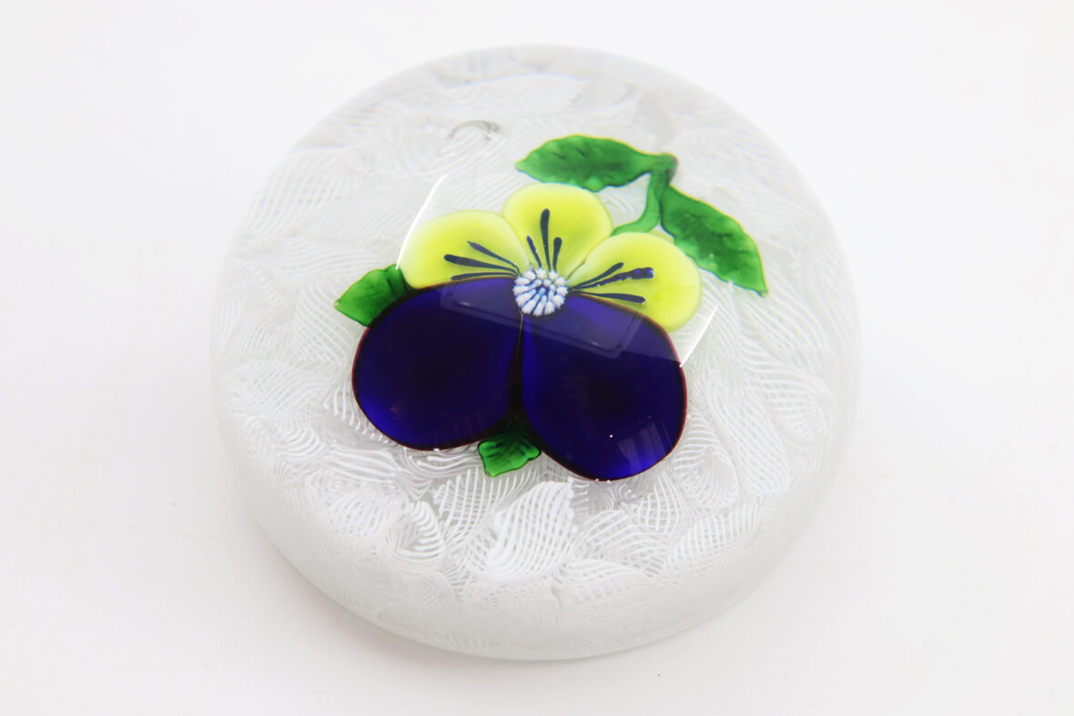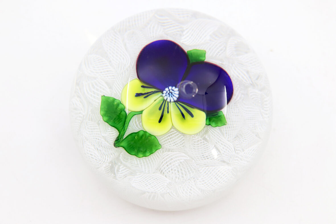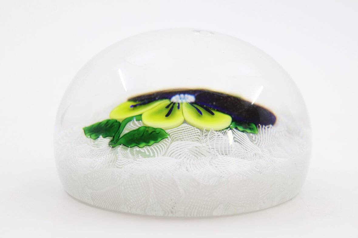 Presse-papier en cristal à décor d’une pensée violette et jaune sur un lit de torsades filigranées blanches.