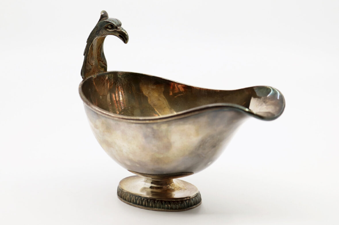 Saucière casque en métal argenté sur piédouche, l’anse en tête d’aigle, le pied à décor d’une frise de feuilles d’eau.