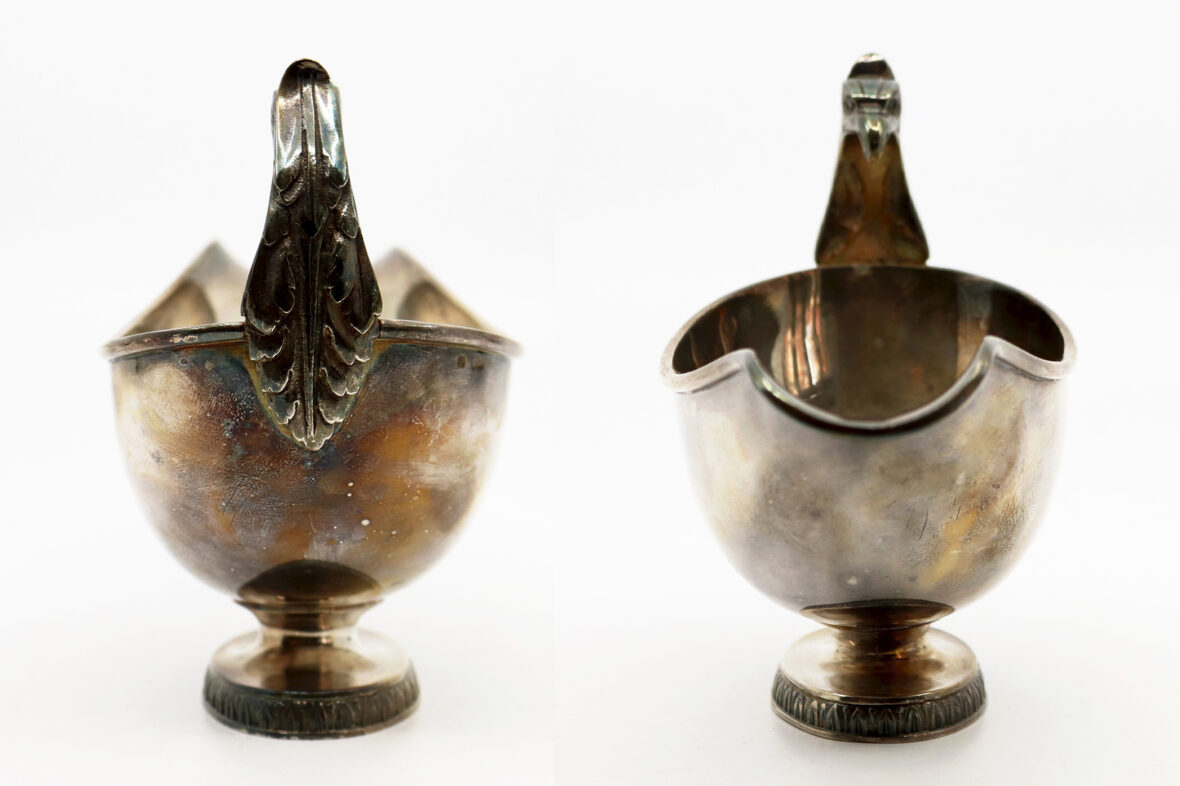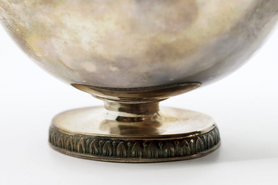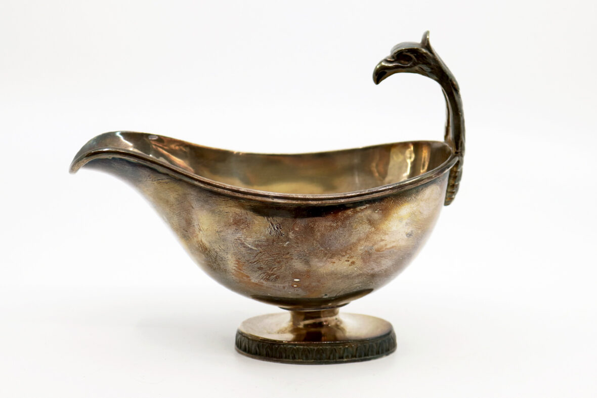 Saucière casque en métal argenté sur piédouche, l’anse en tête d’aigle, le pied à…