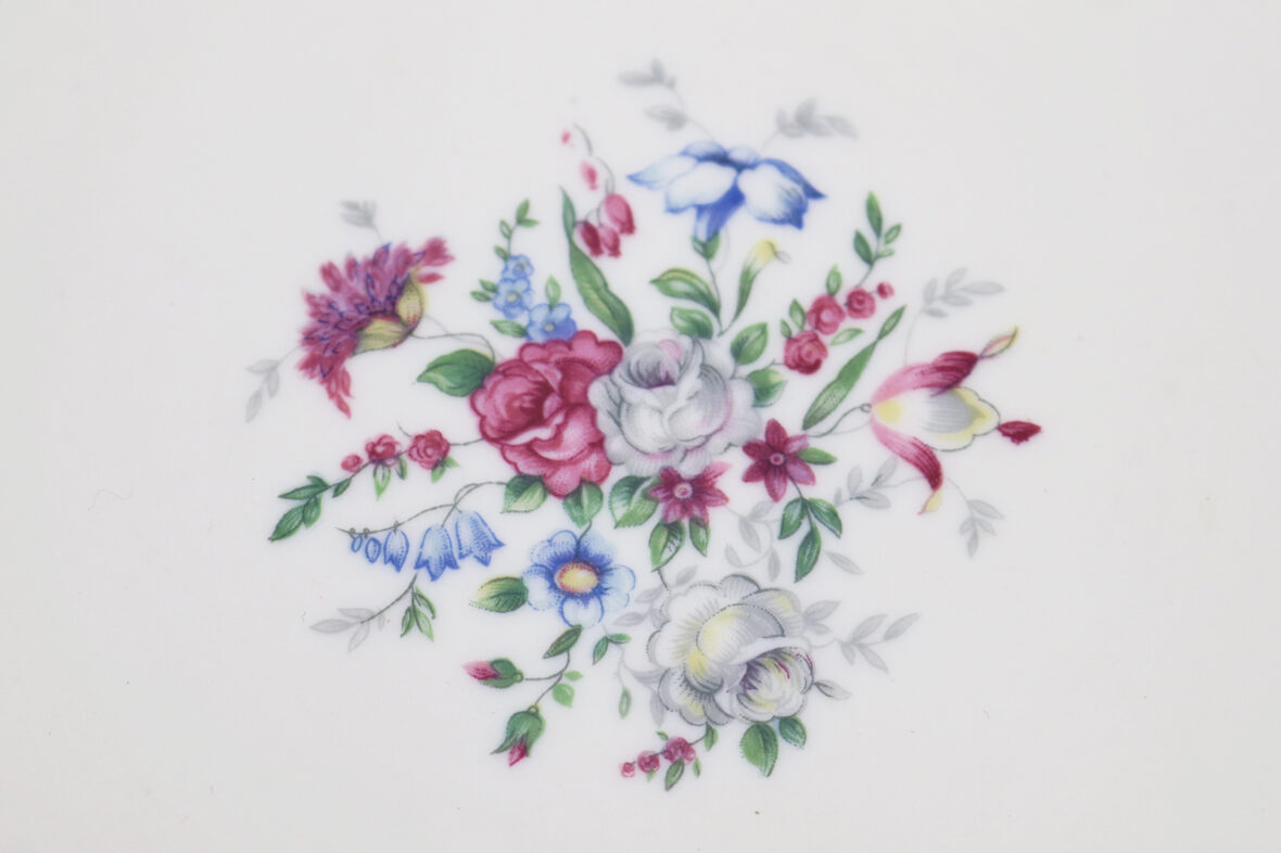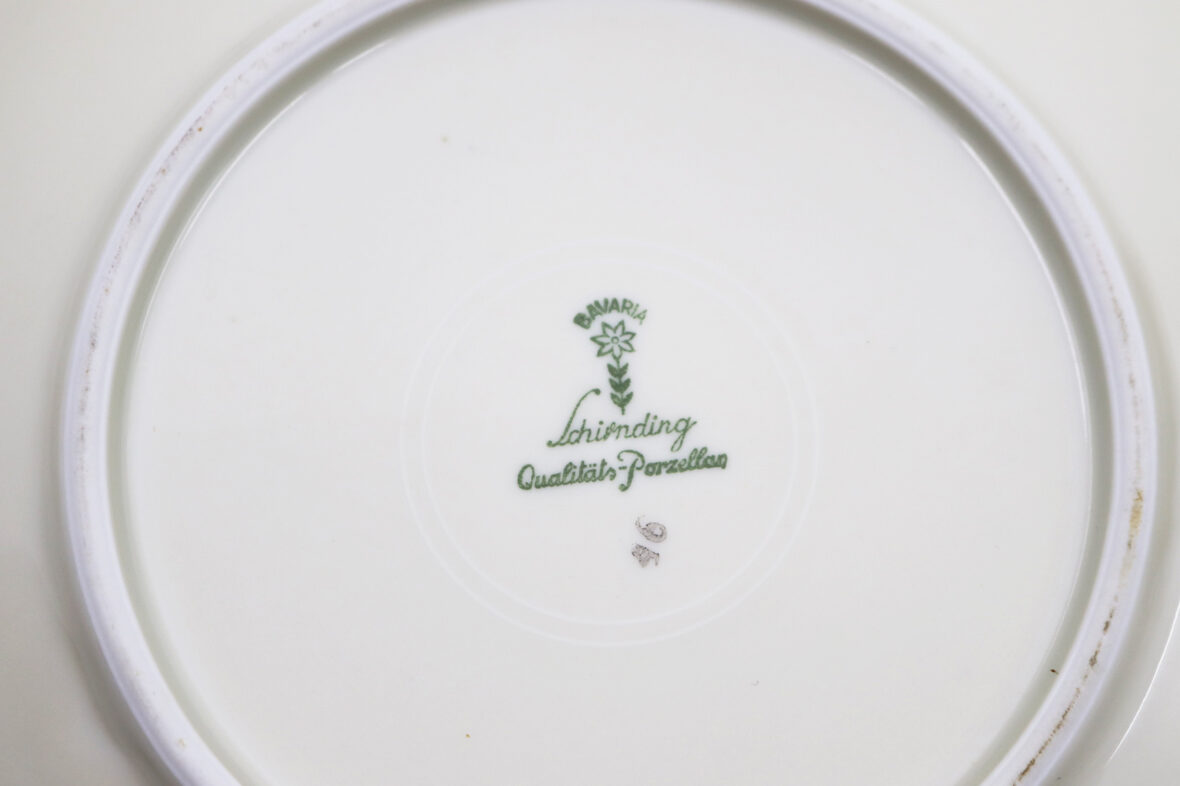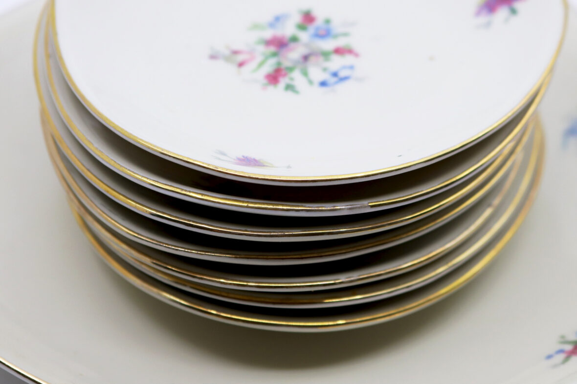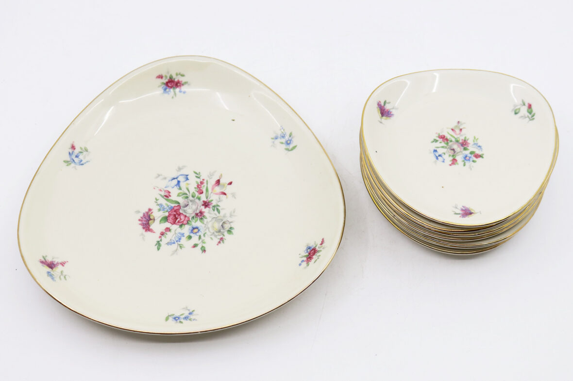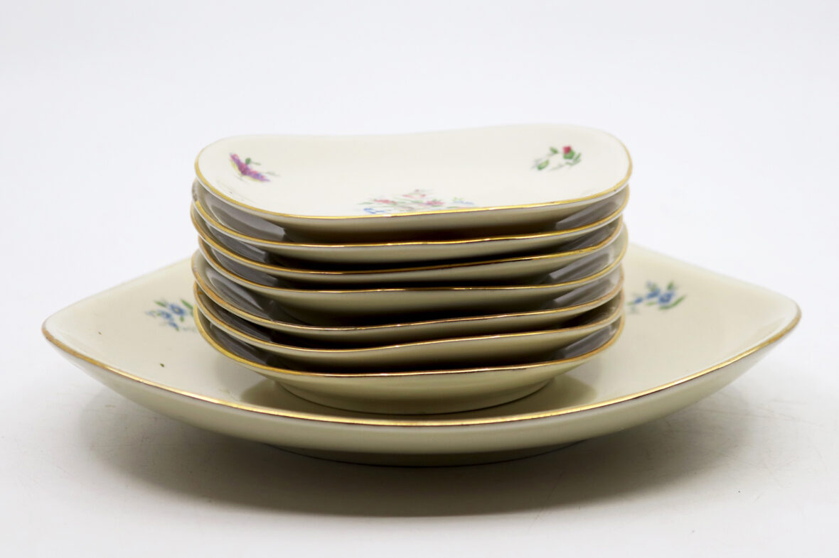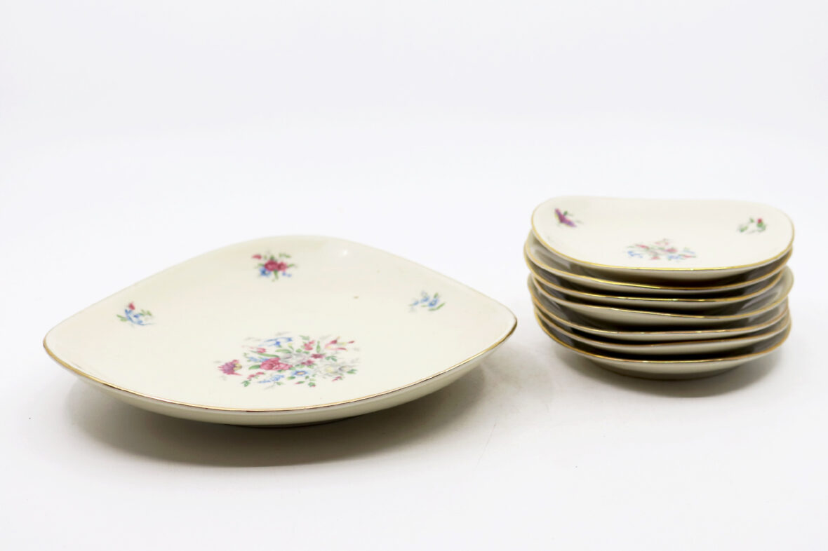 Ensemble de sept petites assiettes et un plat en porcelaine émaillée à décor de fleurs.