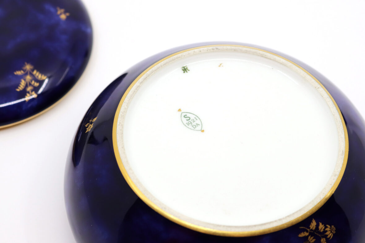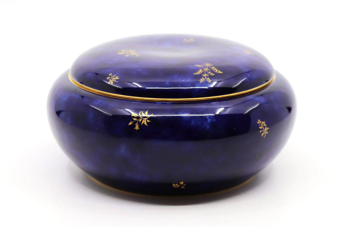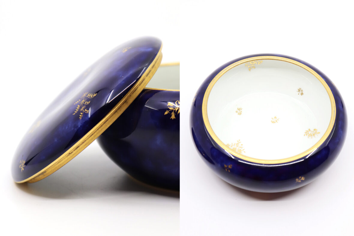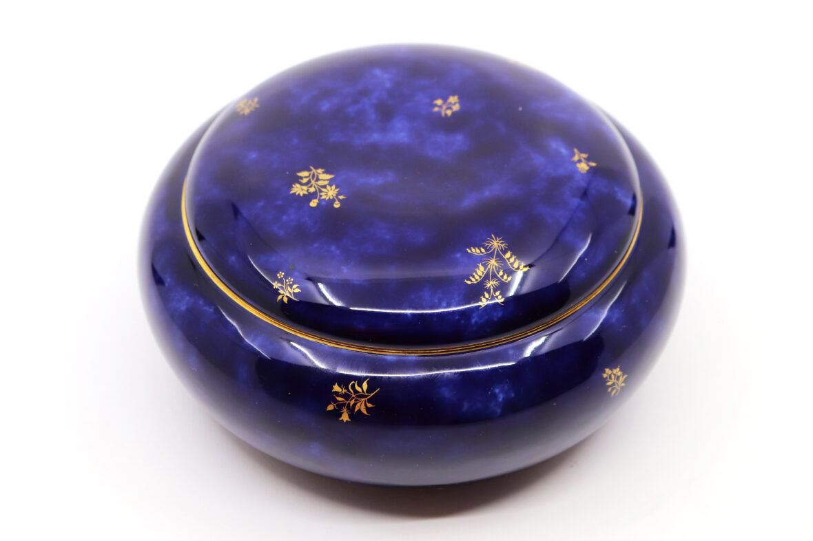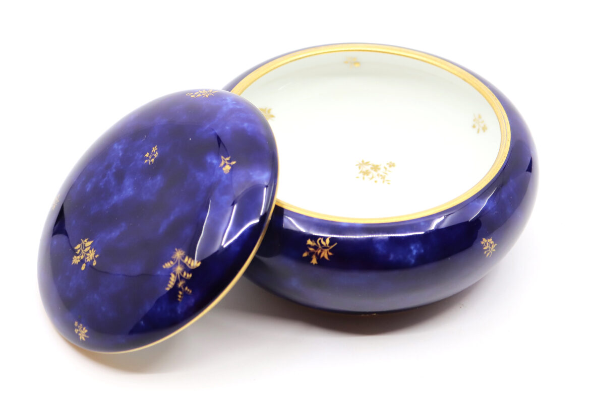 Bonbonnière en porcelaine émaillée à fond gros bleu et décor de fleurettes dorées. Marque Sèvres 1921. Monogramme MT.