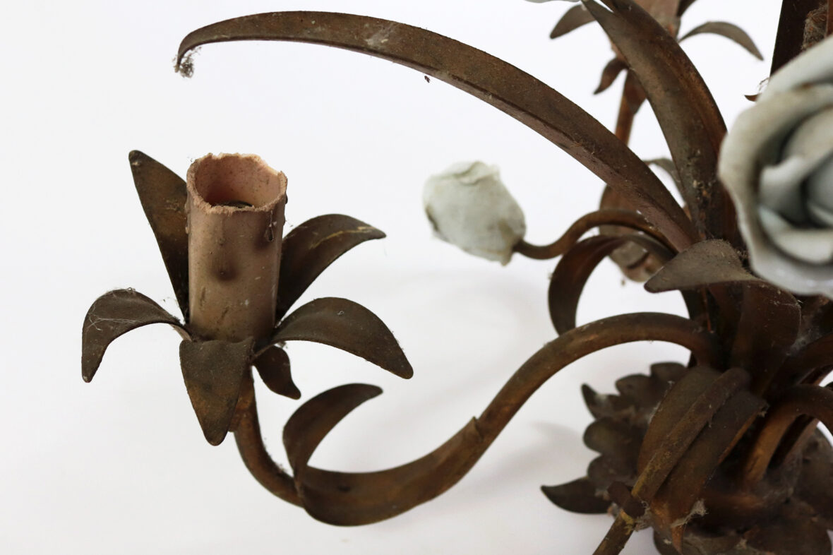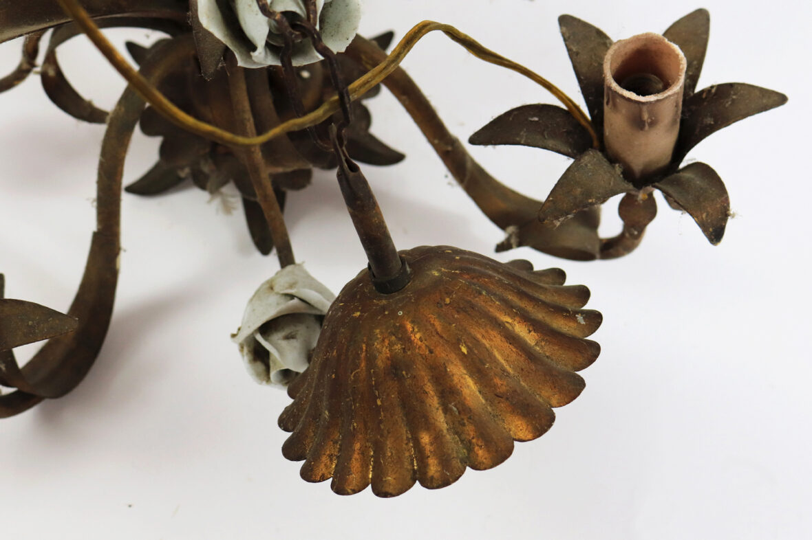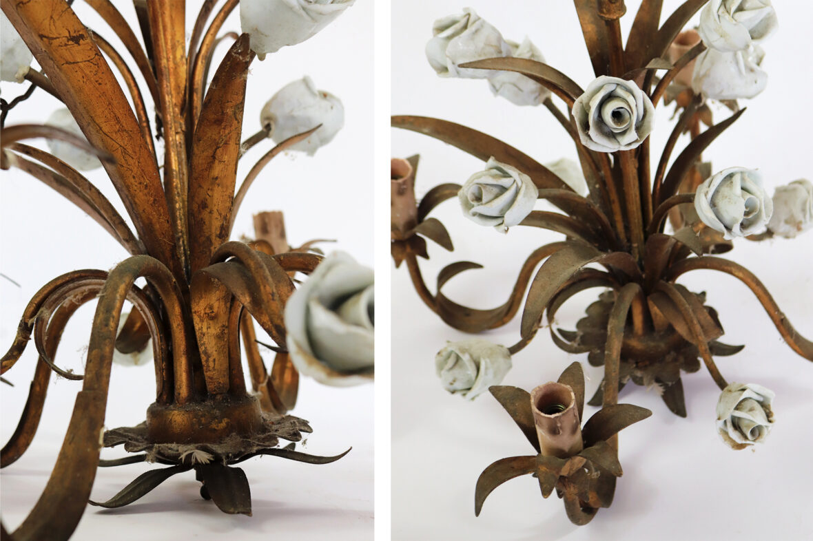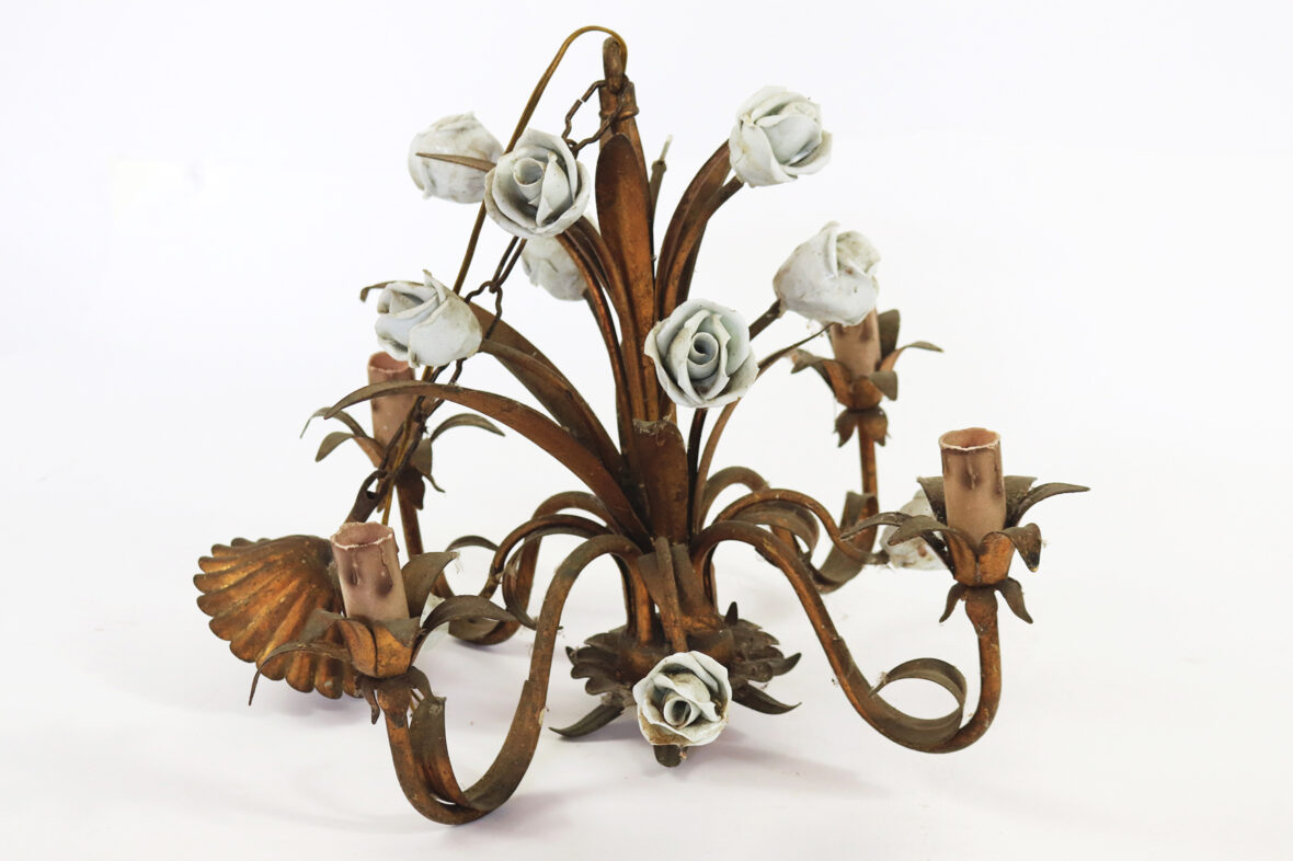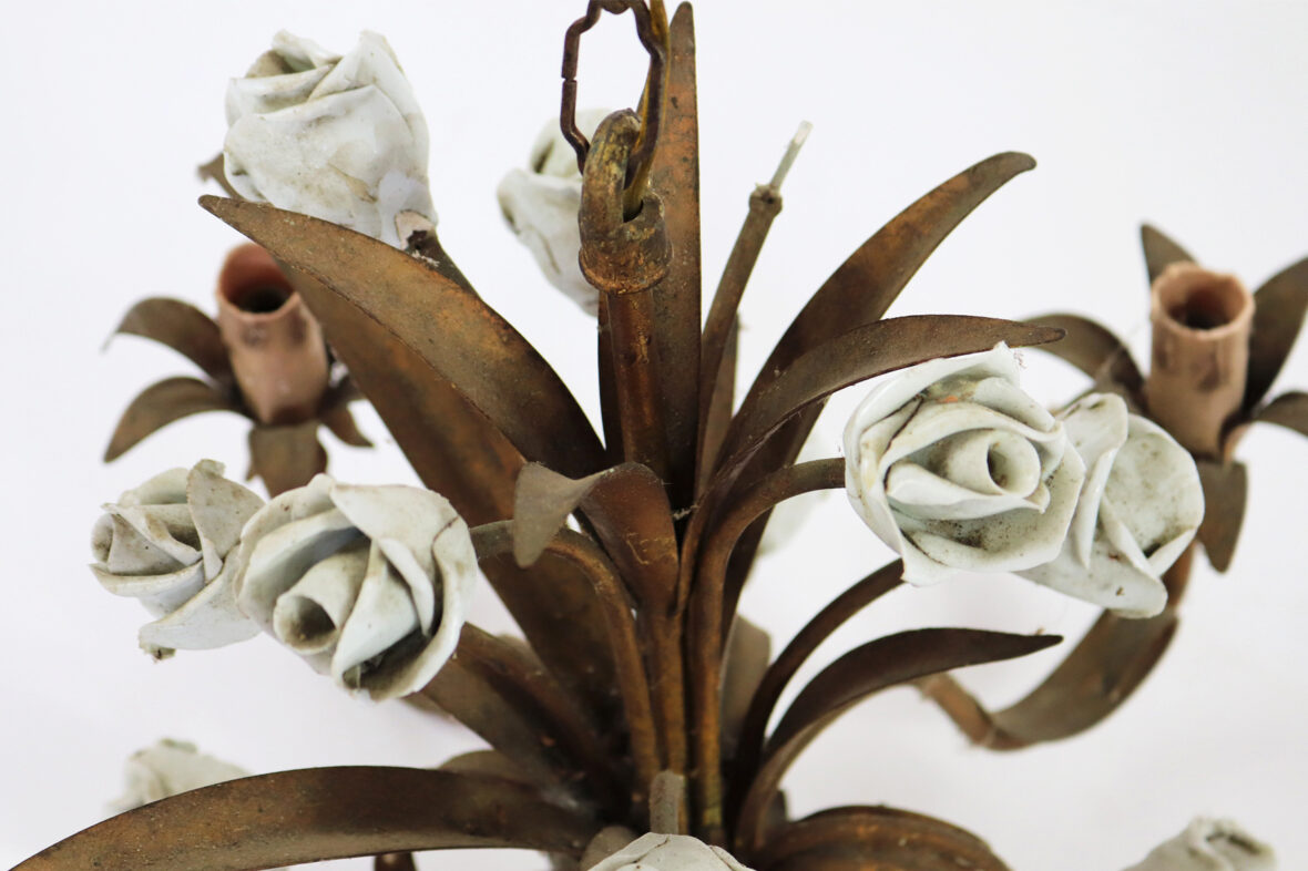 Suspension en bronze doré à quatre bras de lumière, ornée de roses en porcelaine.