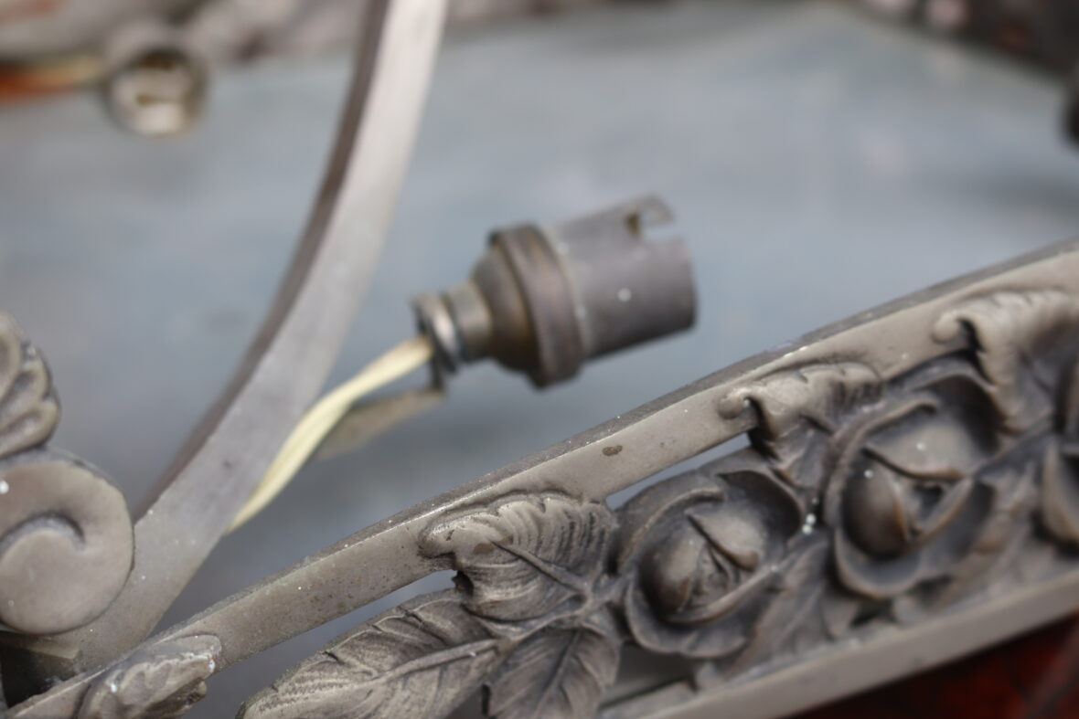 Suspension en fer forgé ajouré à décor de roses, à vasque centrale quadrangulaire…