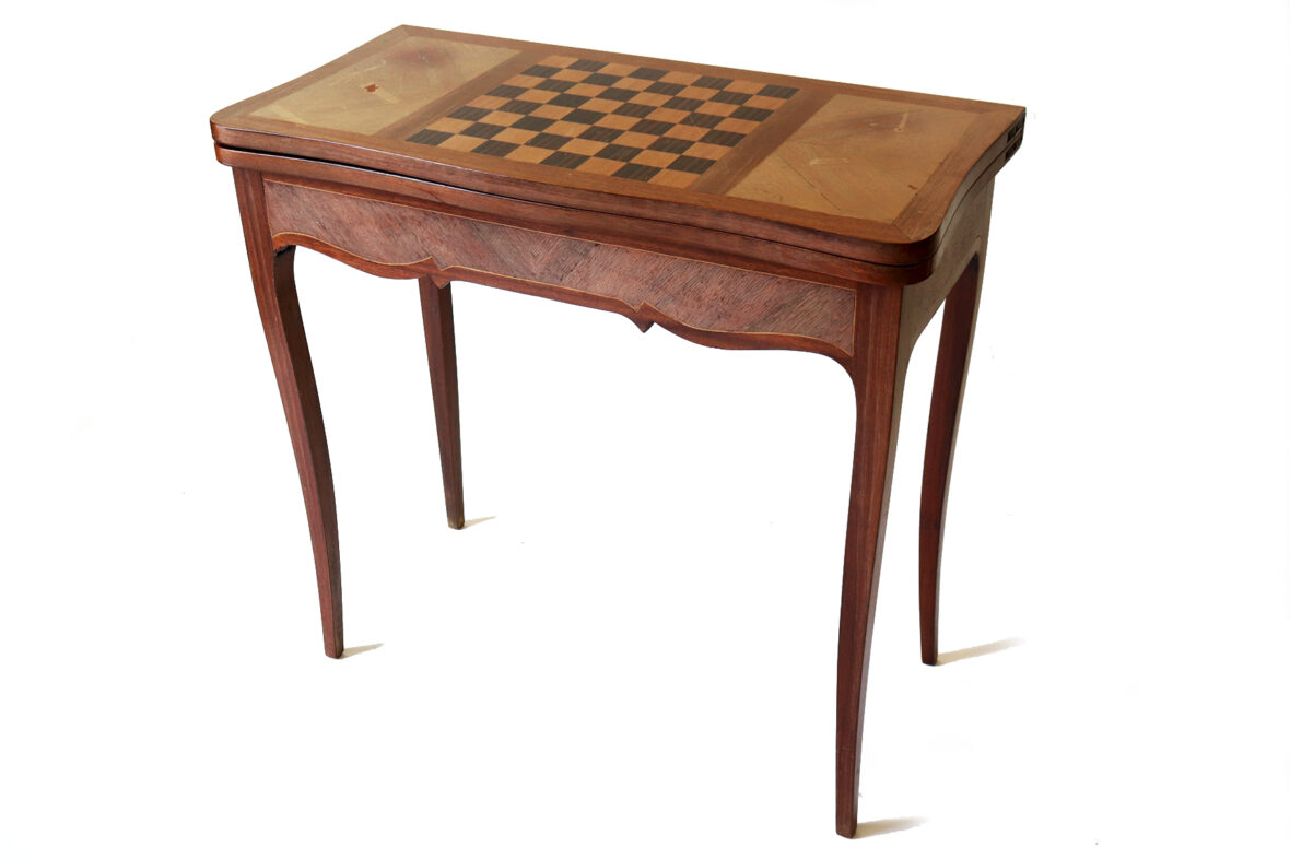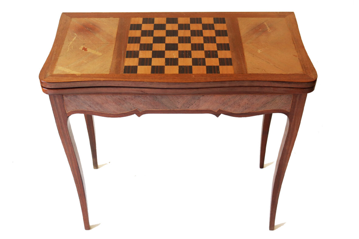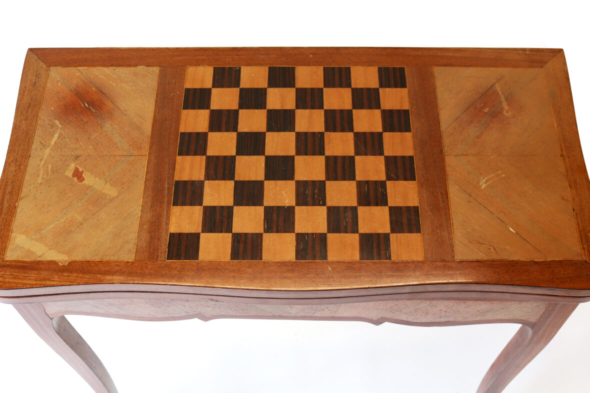 Table à jeu de style Louis XV en bois naturel et bois de placage, le plateau à décor d’un damier s’ouvrant et découvrant un tapis en feutre vert.