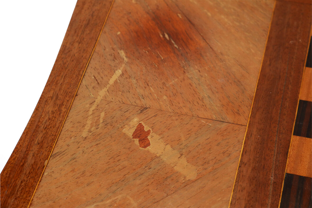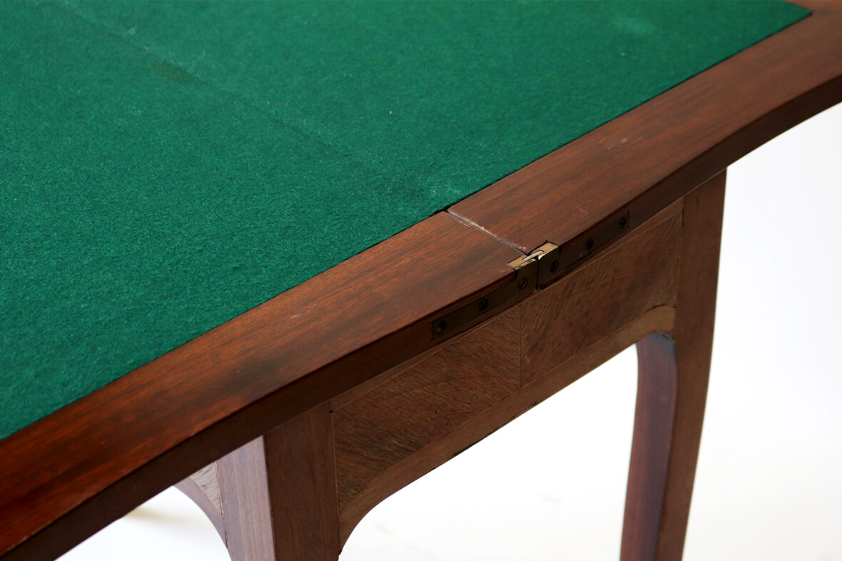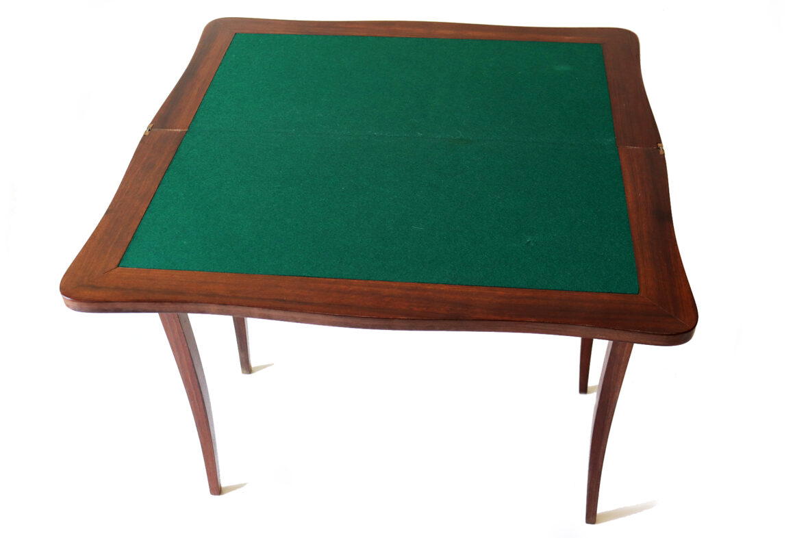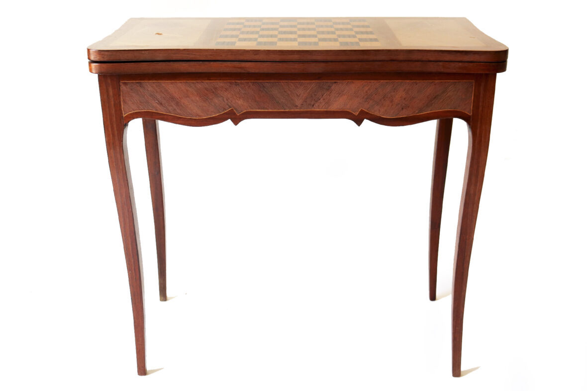 Table à jeu de style Louis XV en bois naturel et bois de placage, le plateau à décor d’un damier s’ouvrant et découvrant un tapis en feutre vert.