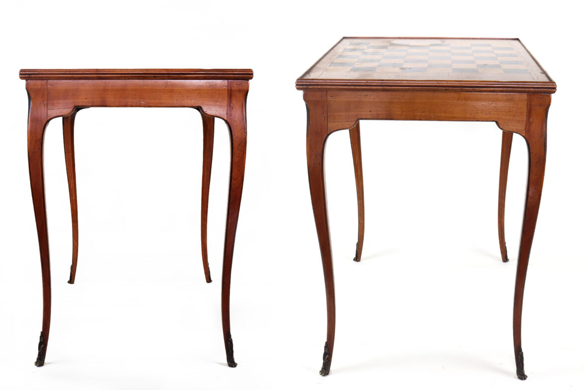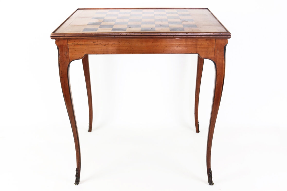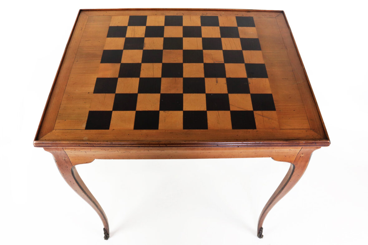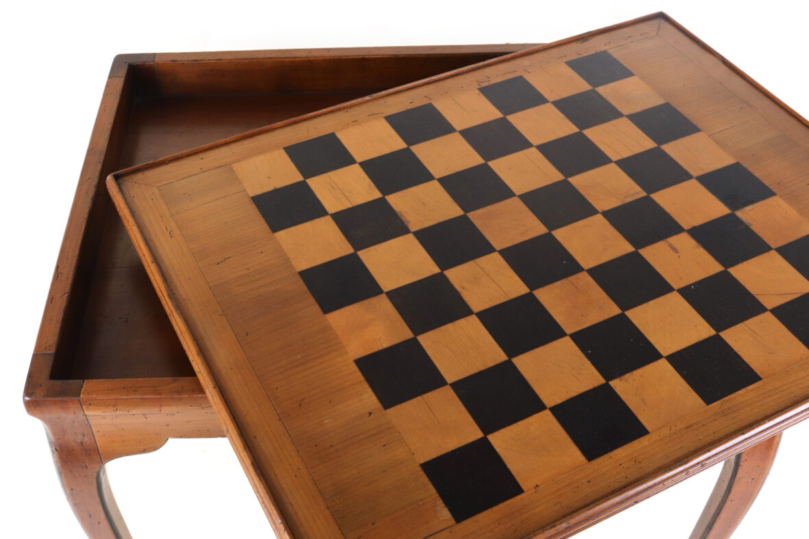 Table à jeu en bois naturel de style Louis XV. Le plateau amovible gainé de cuir rouge doré au petit fer sur une face et marquetée à décor de damier sur l’autre face. Epoque XXe siècle.