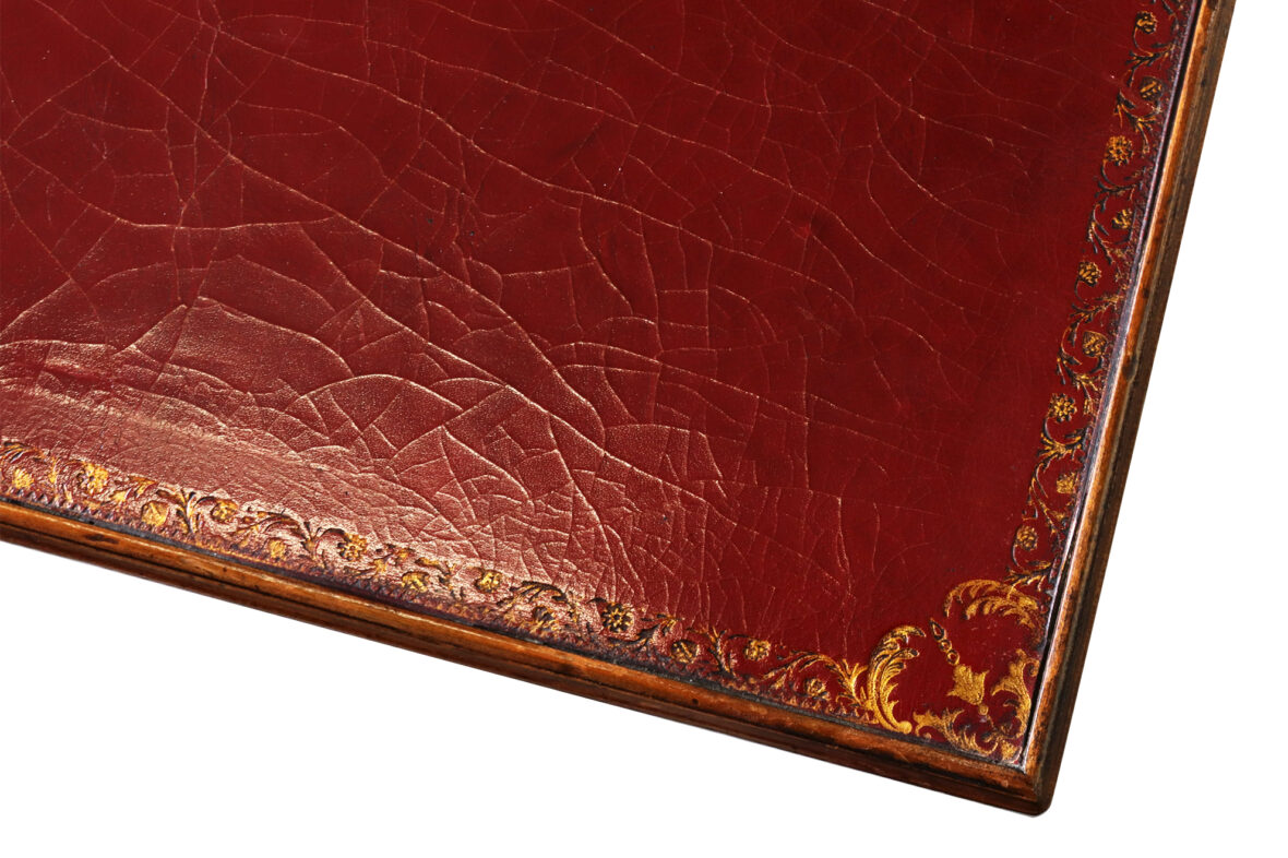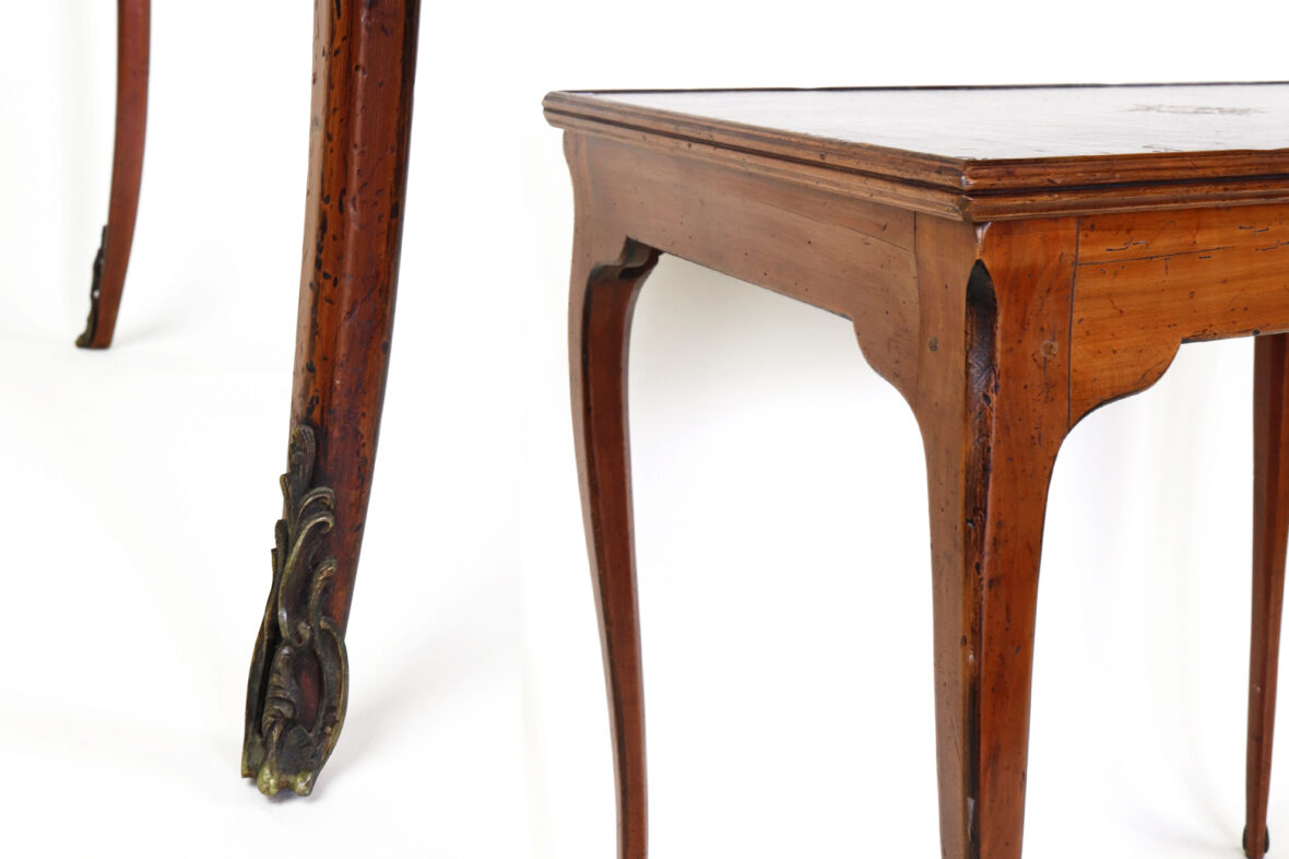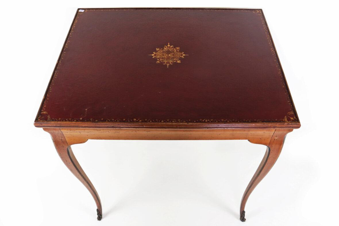 Table à jeu en bois naturel de style Louis XV. Le plateau amovible gainé de cuir