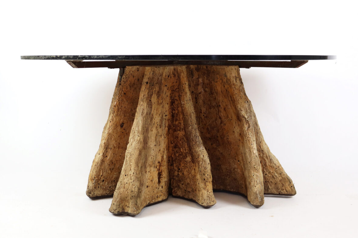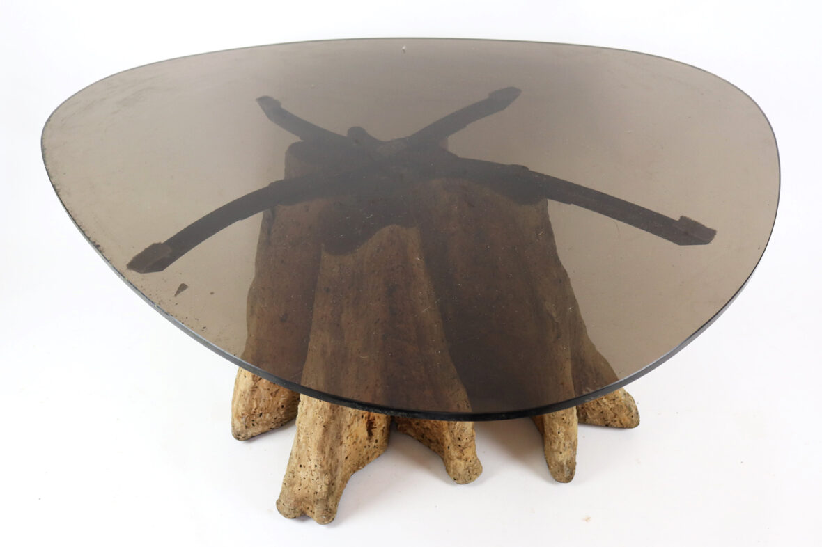Table basse de salon à plateau en verre fumé, le pied formé d’une souche d’arbre.