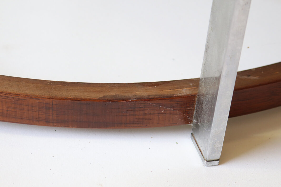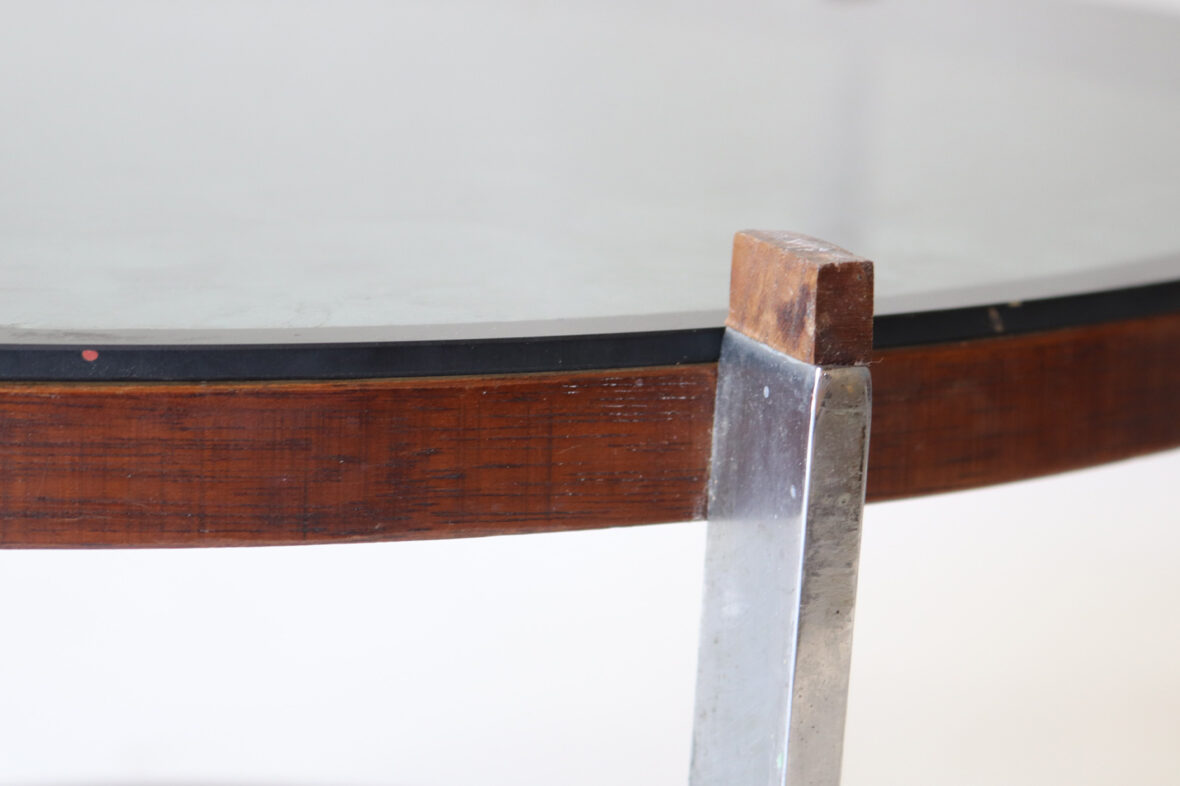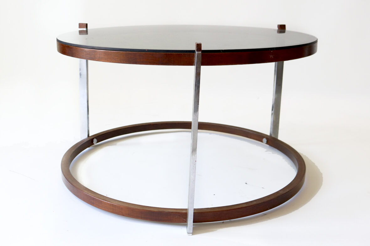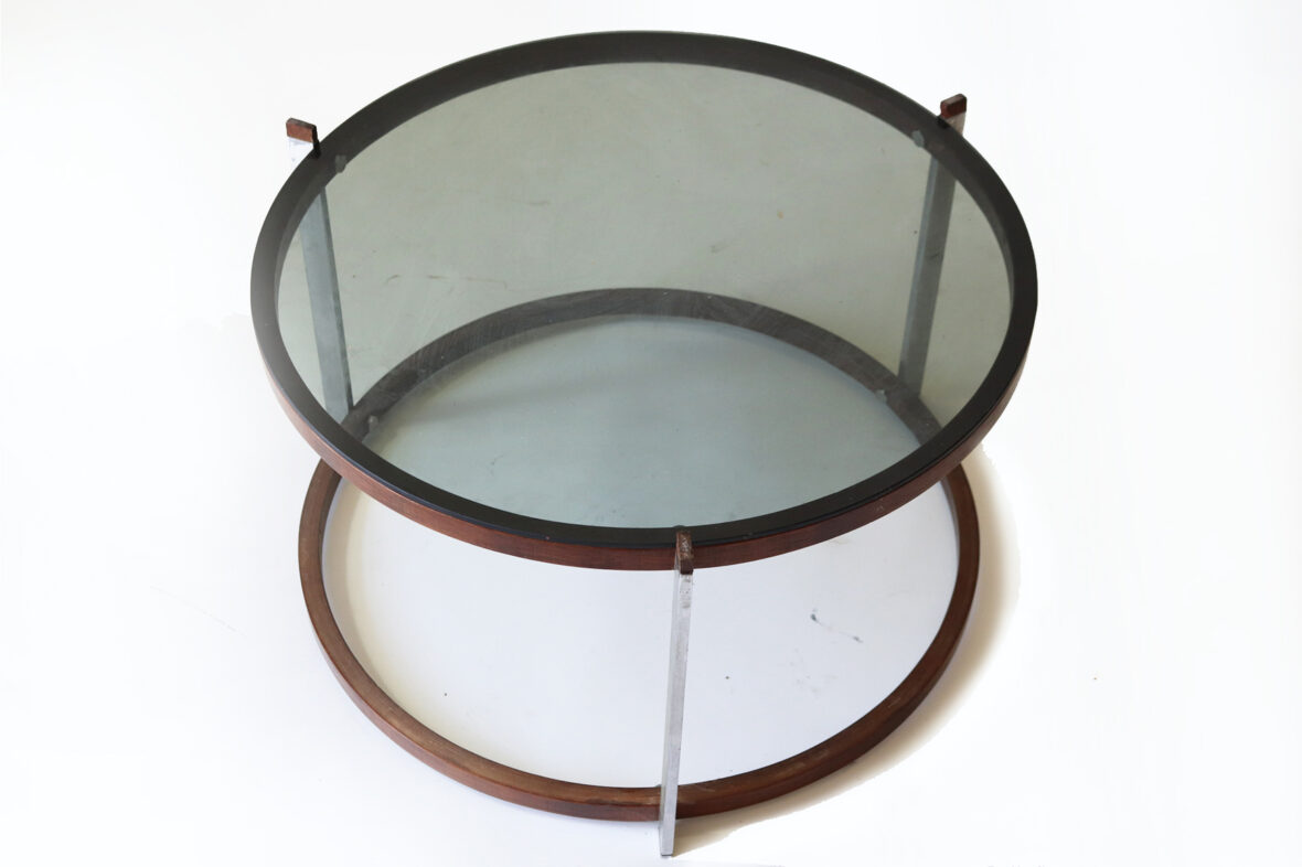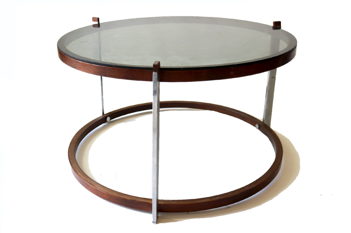 Table basse de salon de forme ronde, le plateau en verre soutenu par trois pieds en métal réunis par une base circulaire en bois.