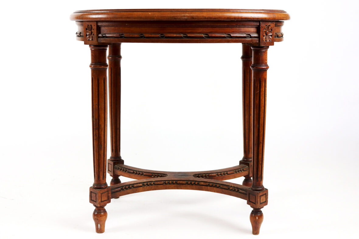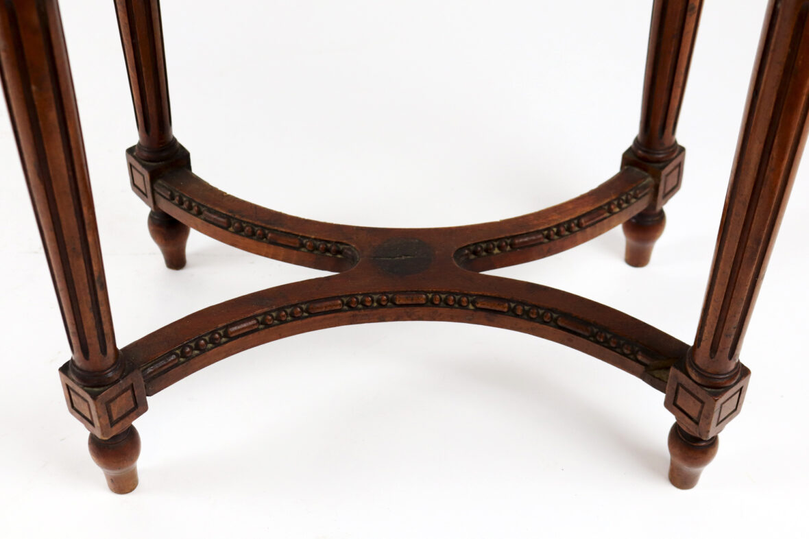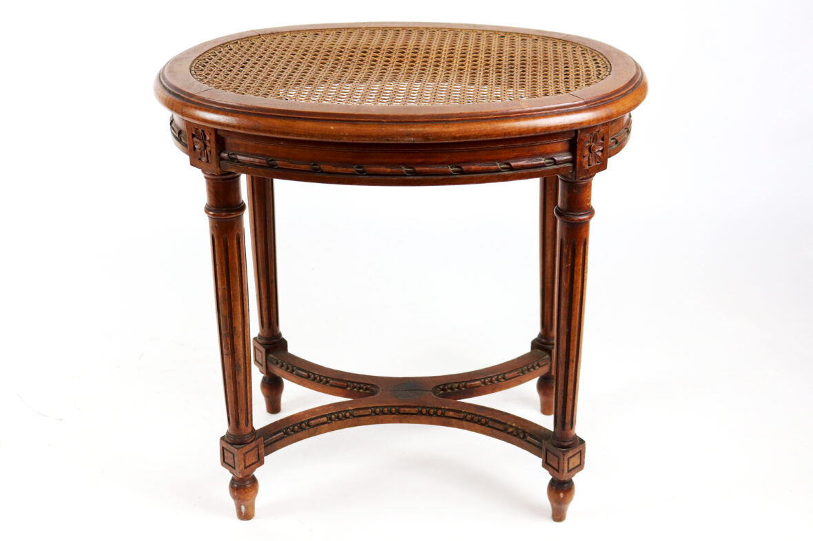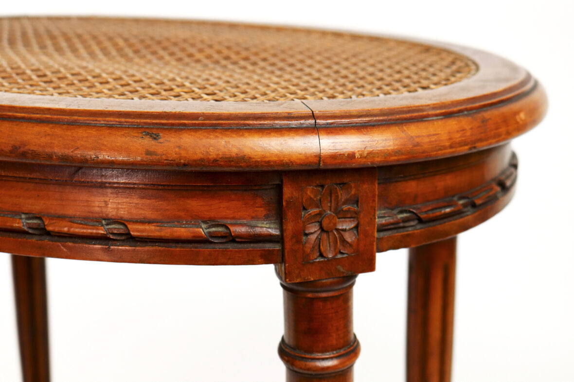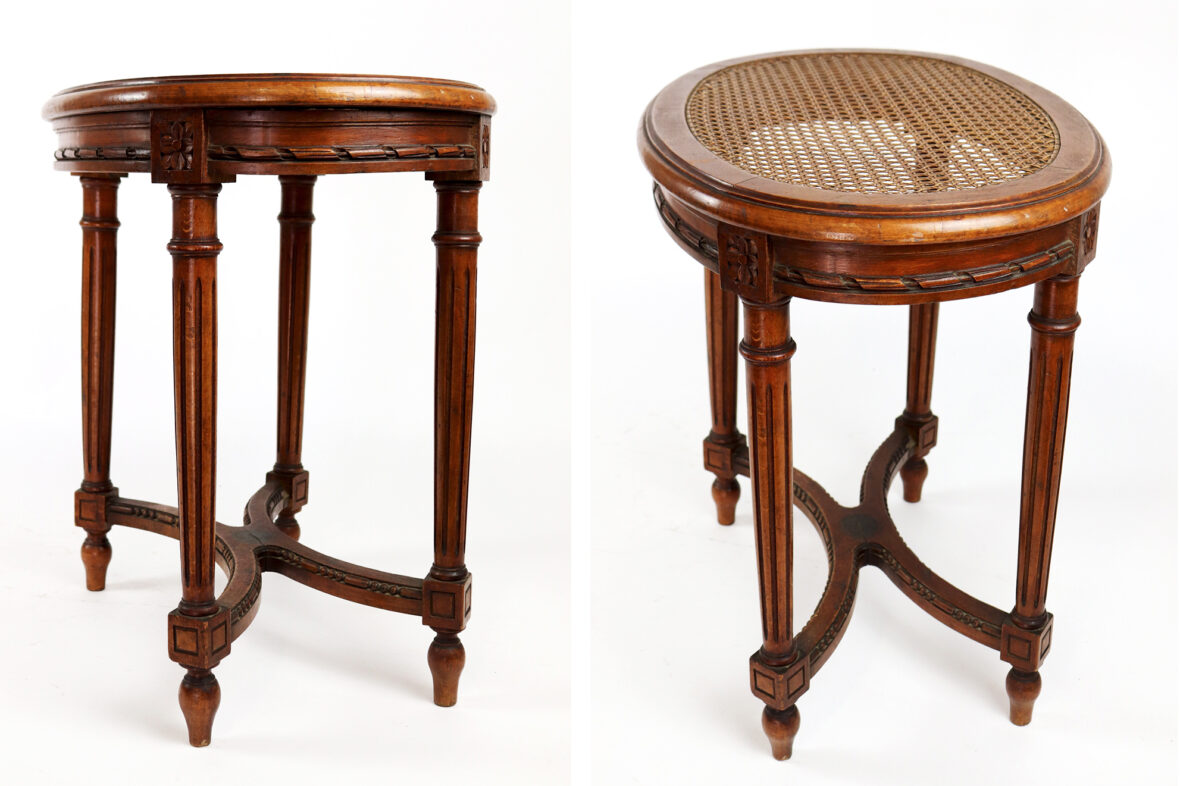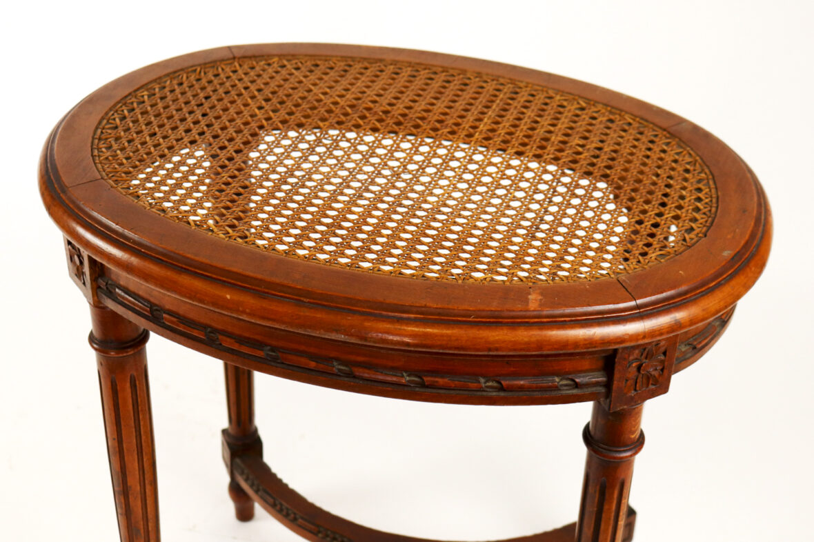 Tabouret de piano en bois naturel mouluré et sculpté à décor de frise rubannée, frise de perles et fleurettes. Les quatre pieds en colonne cannelée joints par une entretoise en X. De style Louis XVI.