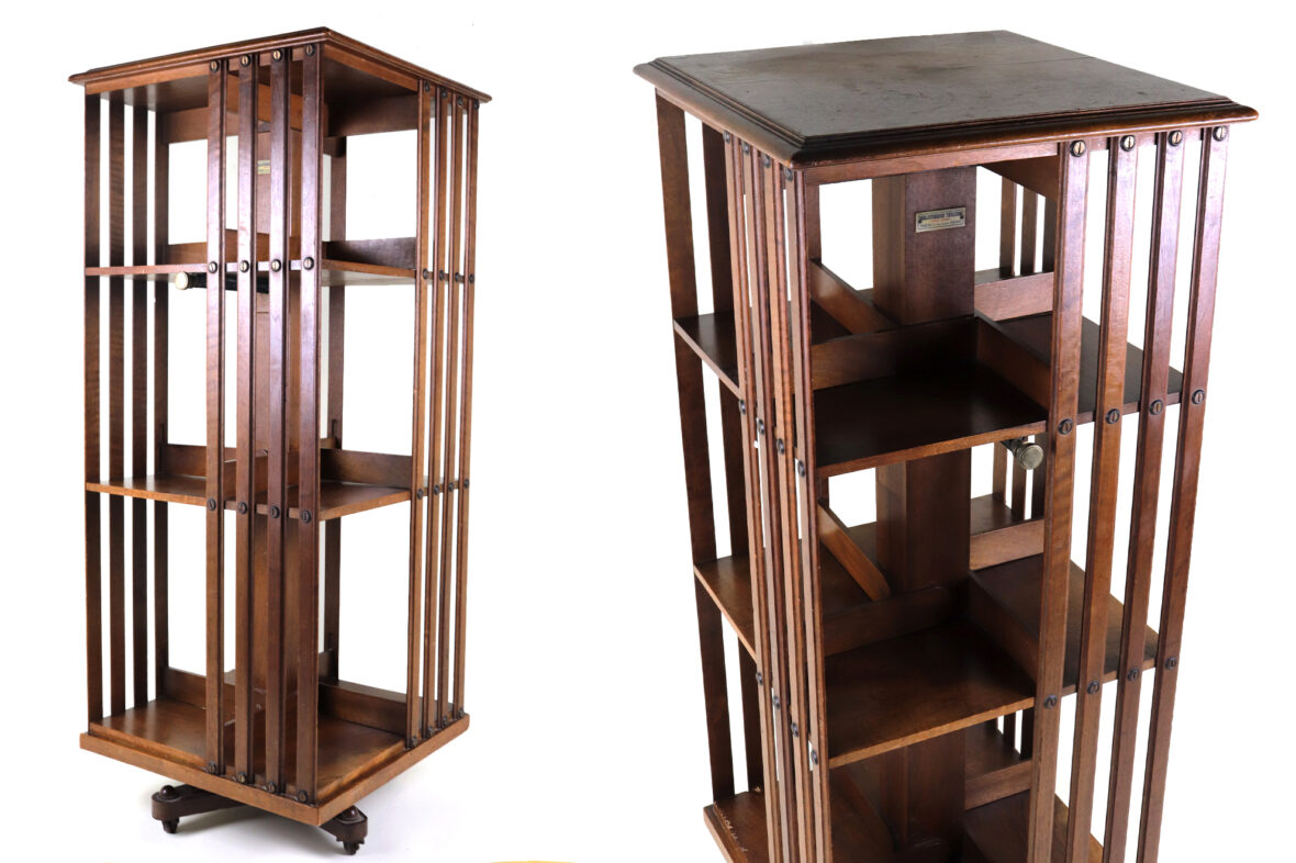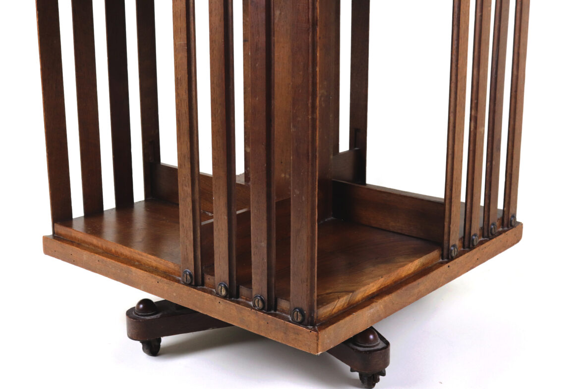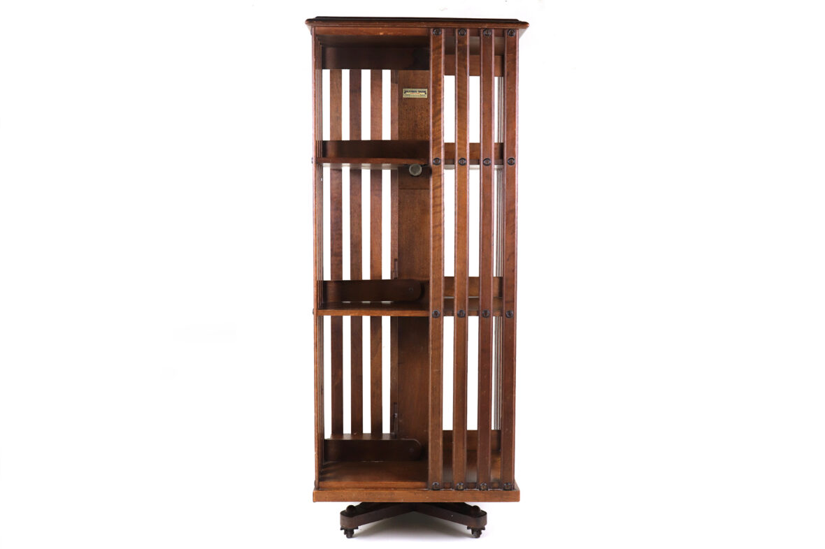 Bibliothèque tournante en bois naturel, l’ensemble reposant sur un socle circulaire. Plaque du fabricant. XIXe siècle.