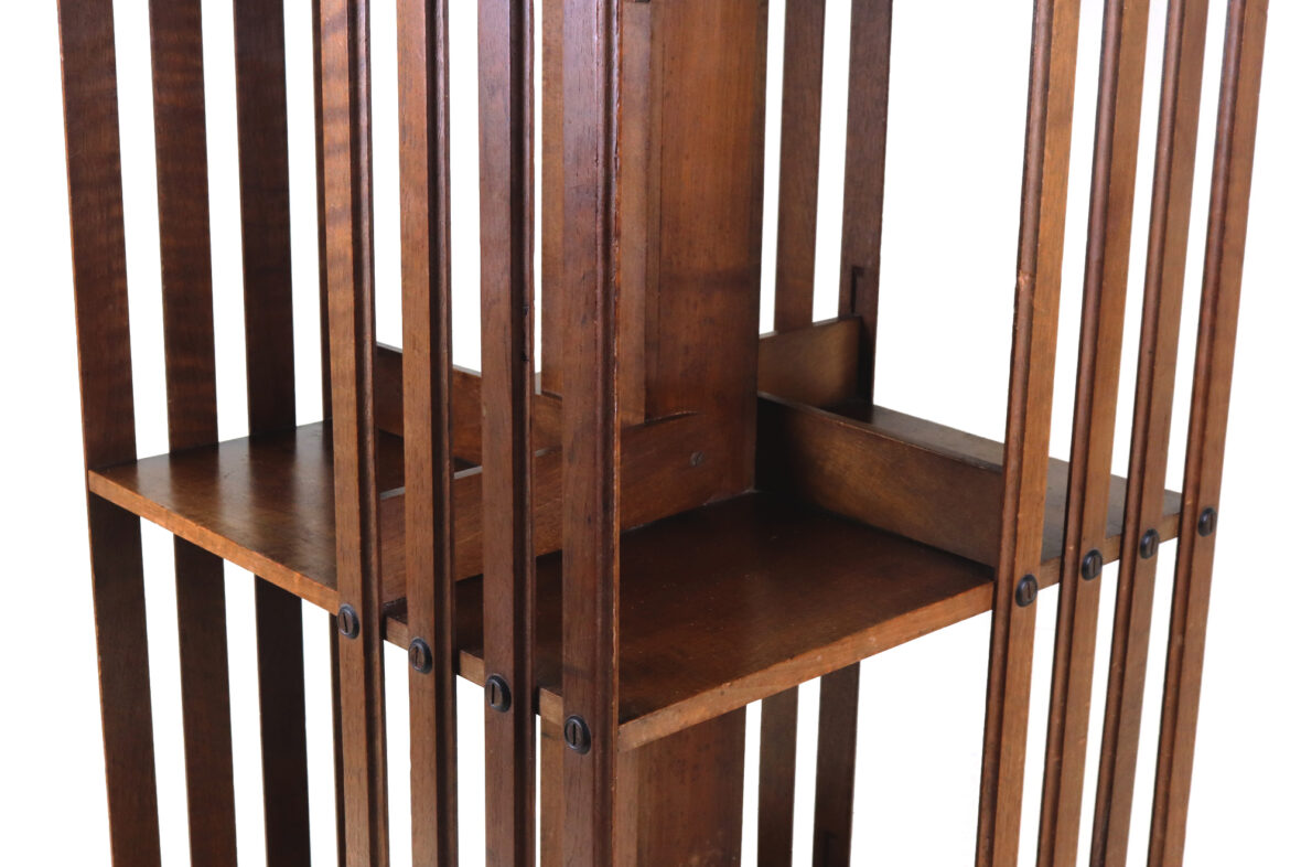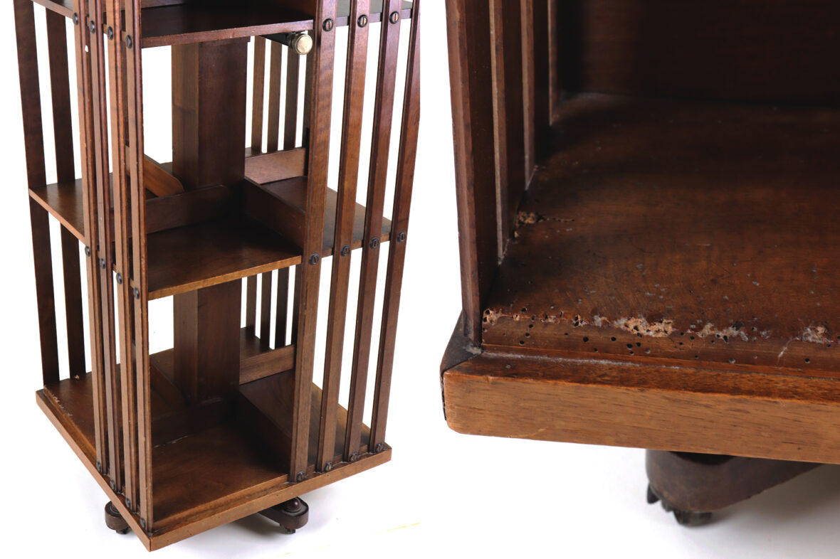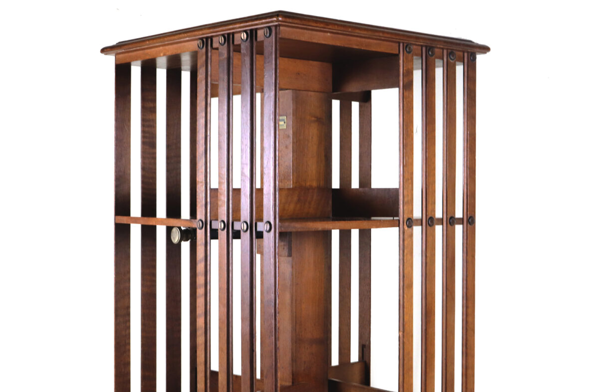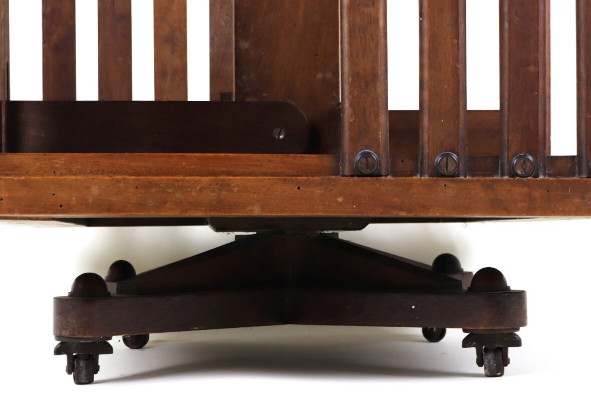 Bibliothèque tournante en bois naturel, l’ensemble reposant sur un socle circulaire. Plaque du fabricant. XIXe siècle.
