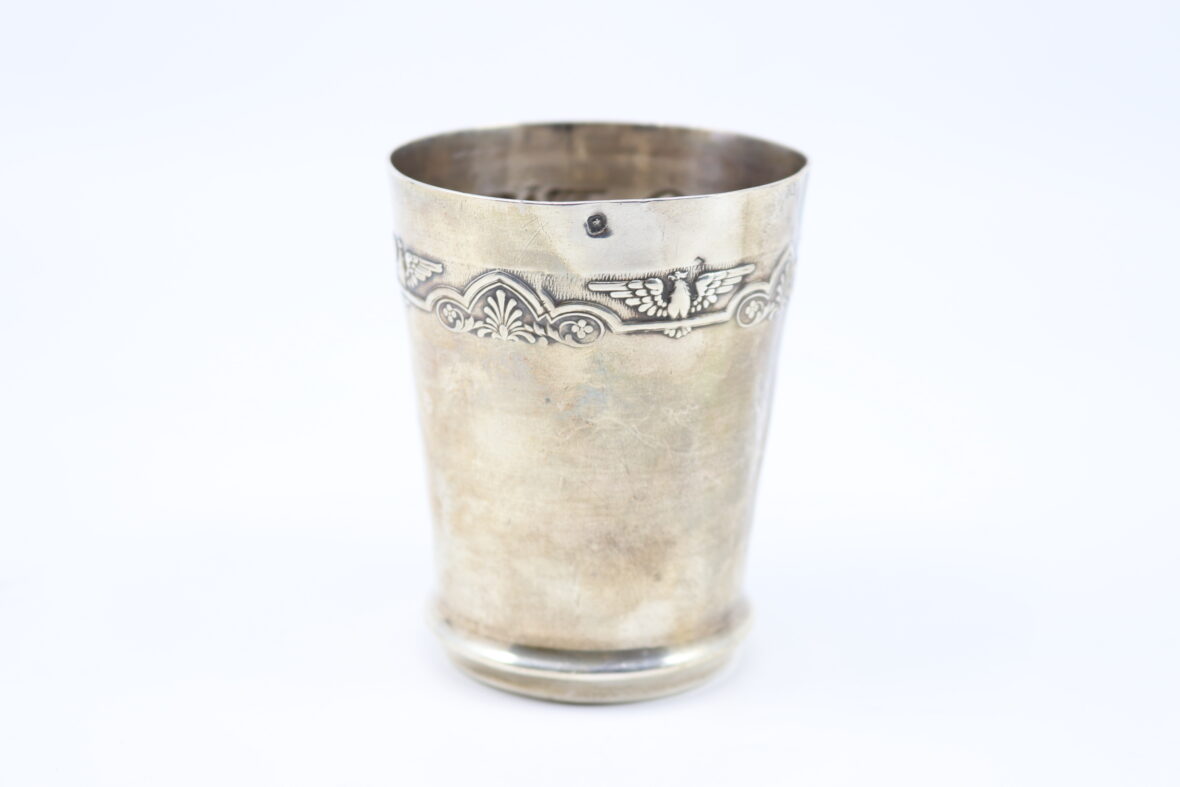 Timbale en argent à décor d’une frise d’oiseaux branchés, palmettes et fleurettes. Chiffrée.
