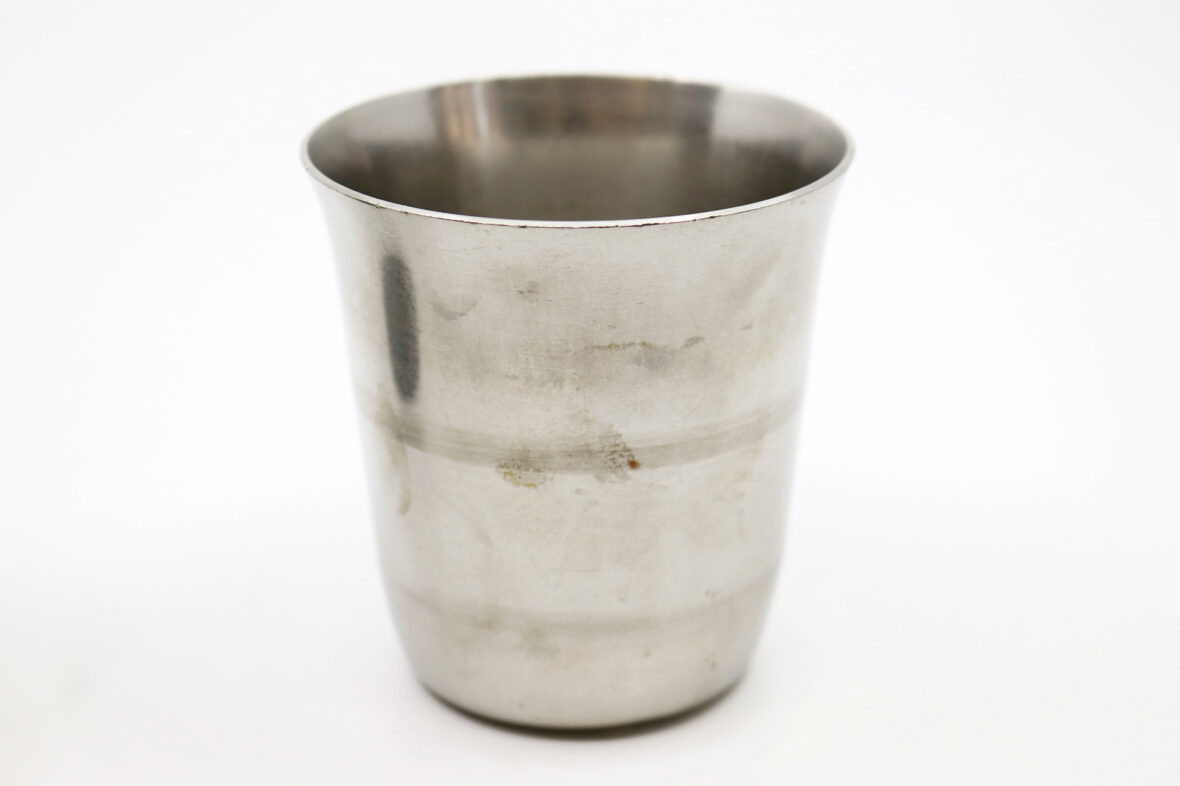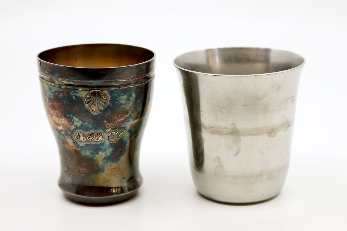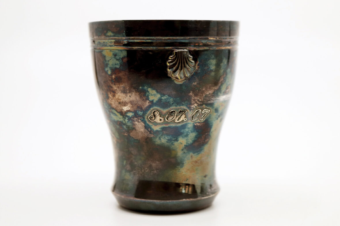 Timbale en métal argenté à décor de coquilles et filets. Chiffrée TS et datée 8.07.07.