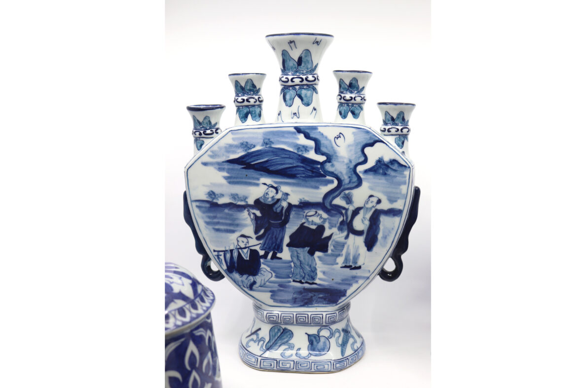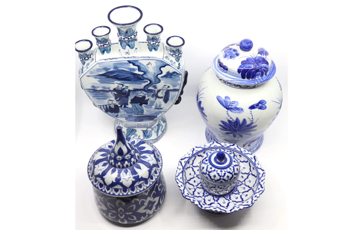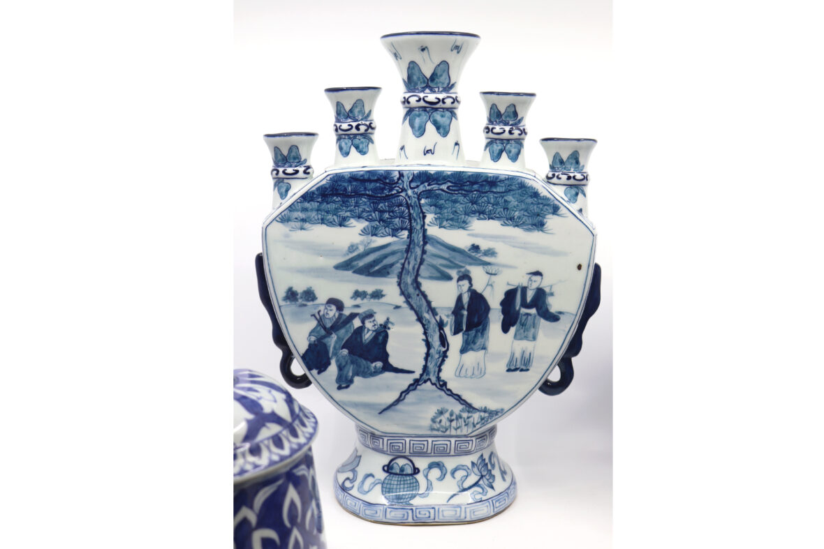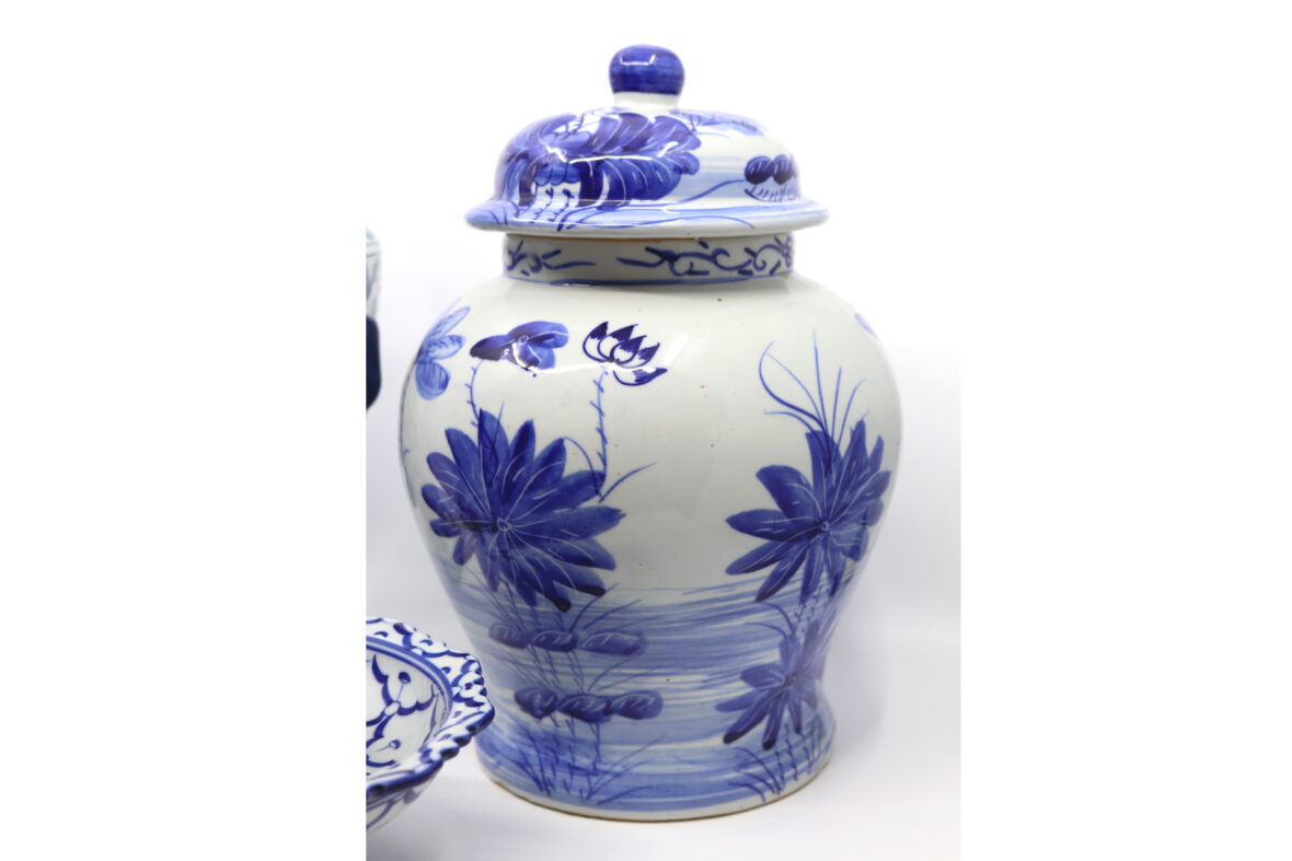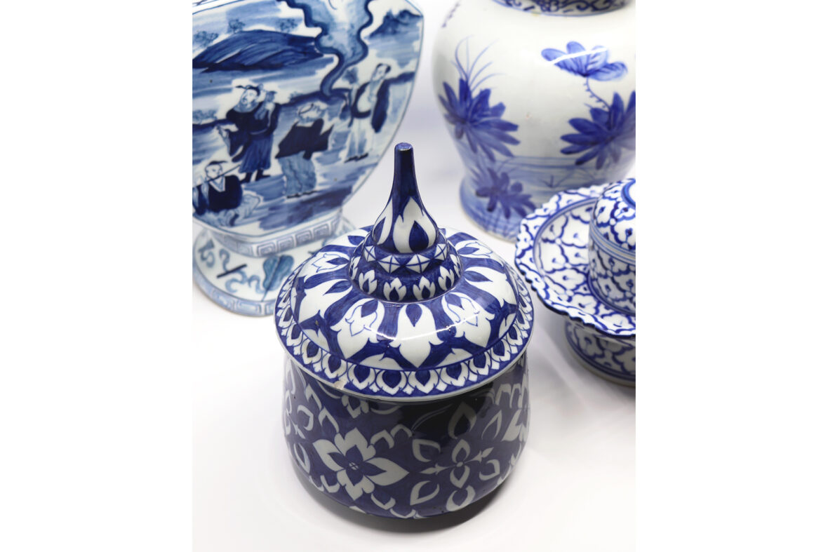 Ensemble en porcelaine blanc et bleu comprenant une potiche couverte à décor de fleurs, un pot couvert la prise en pointe, un petit pot couvert sur son présentoir et un vase tulipière à décor de scènes animées.