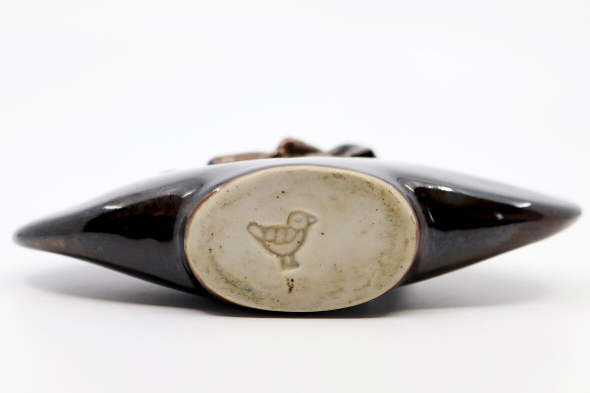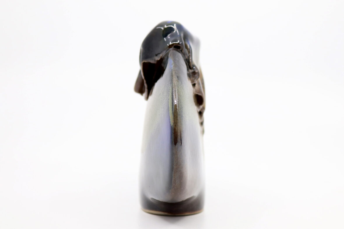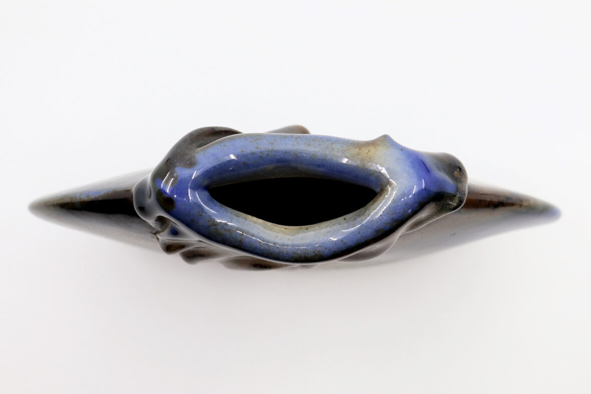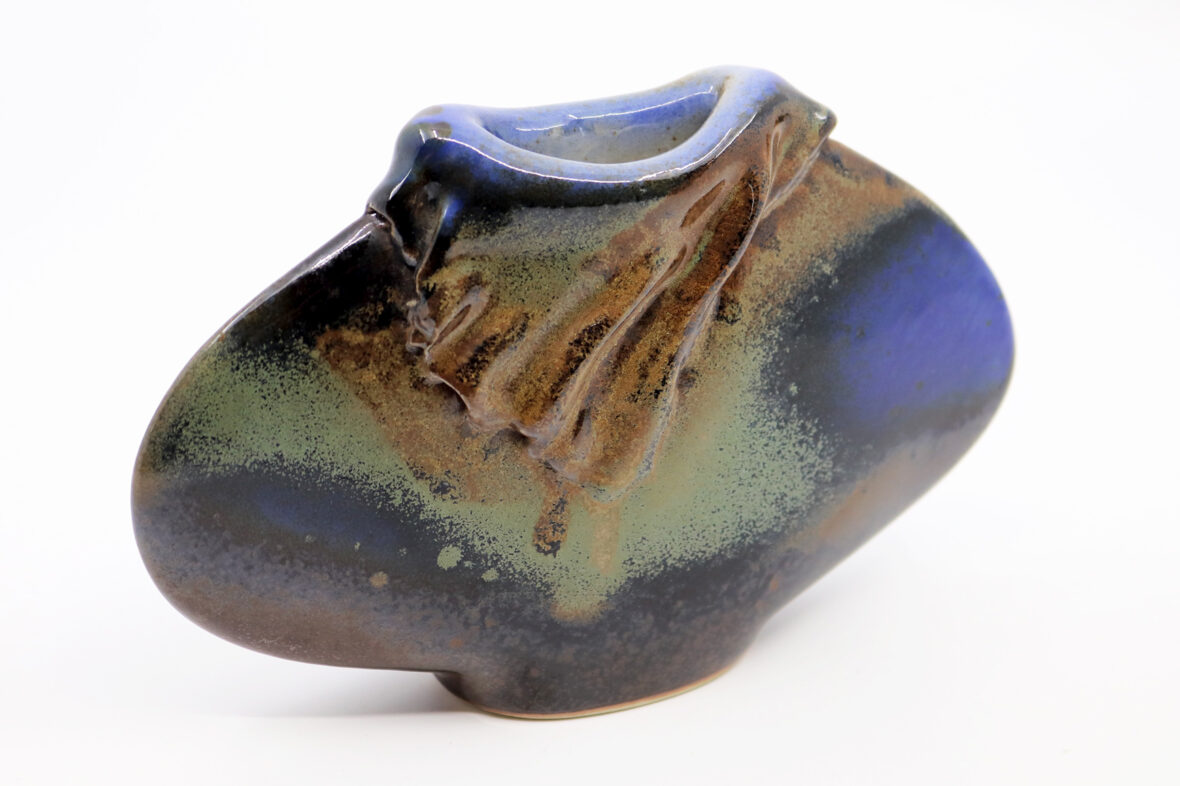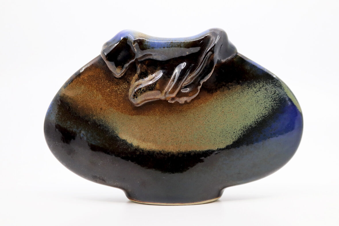 Petit vase méplat en grès émaillé à couverte nuancée brun et bleu.