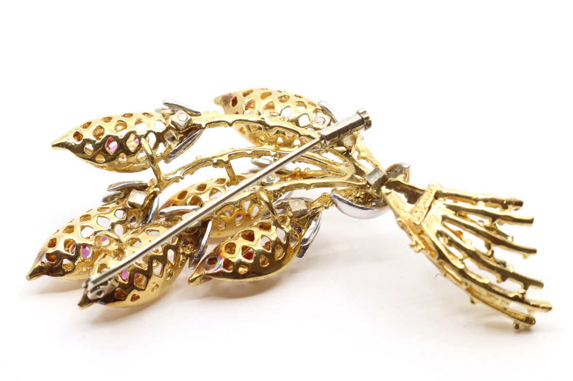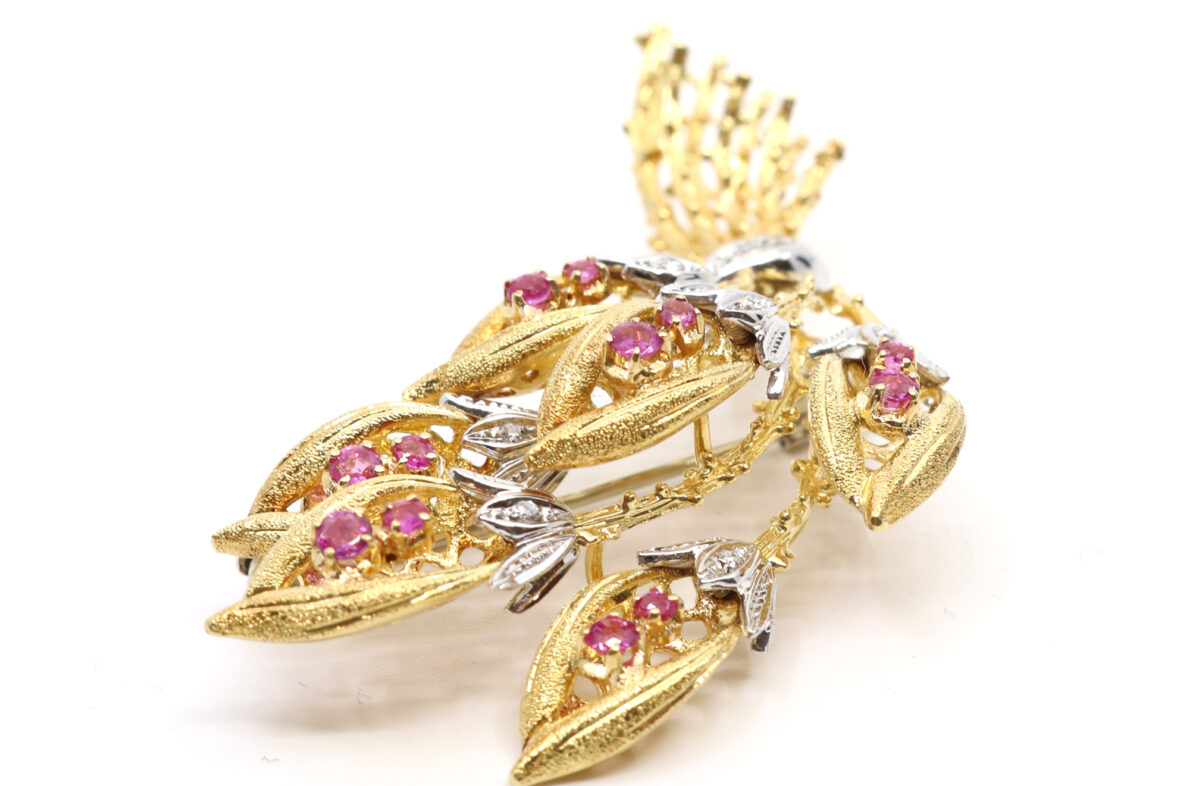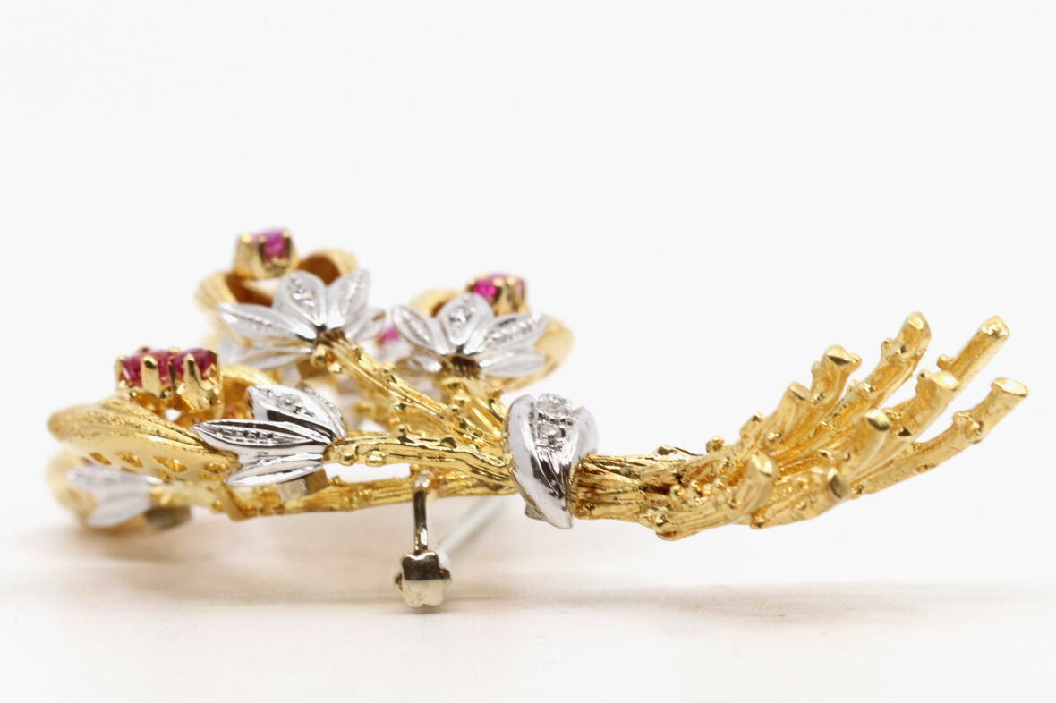 Broche fleurie en or jaune ornée de petites roses et de petits rubis.