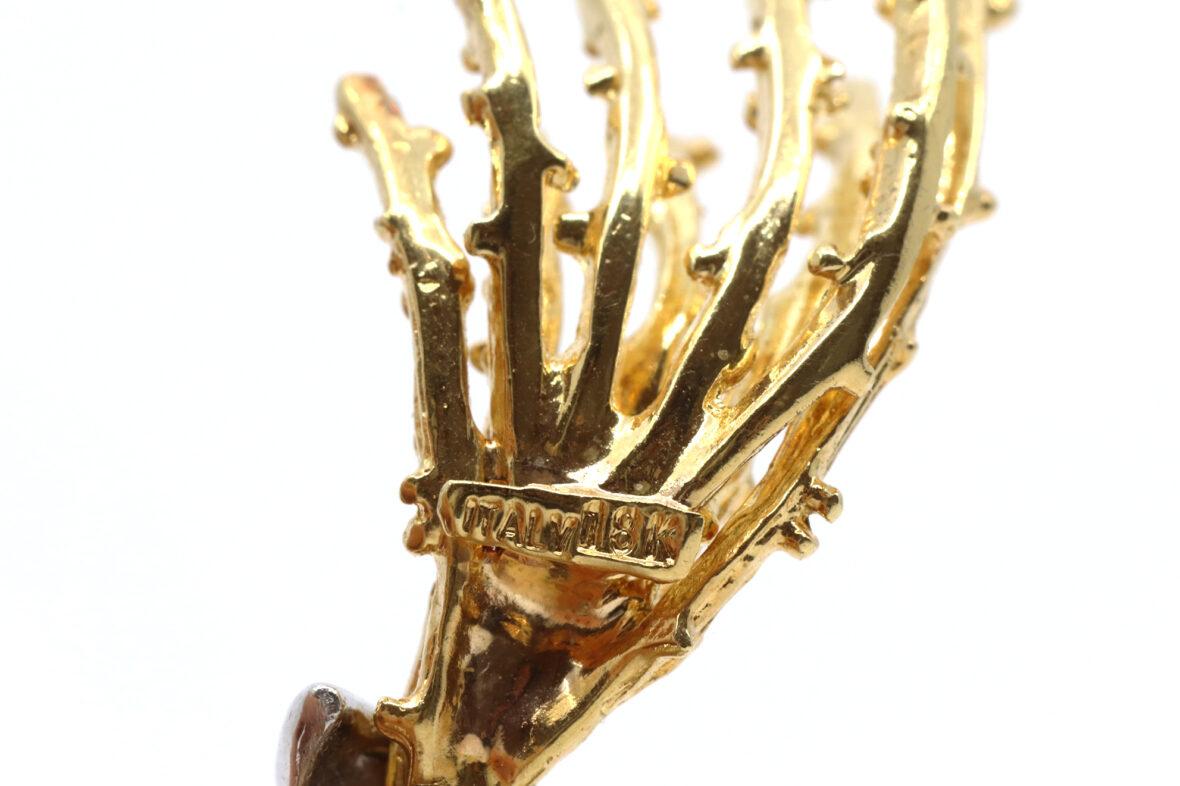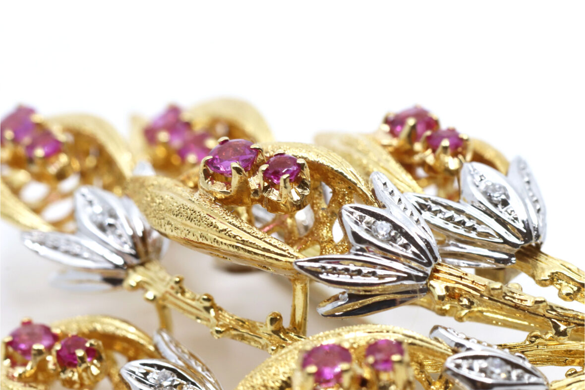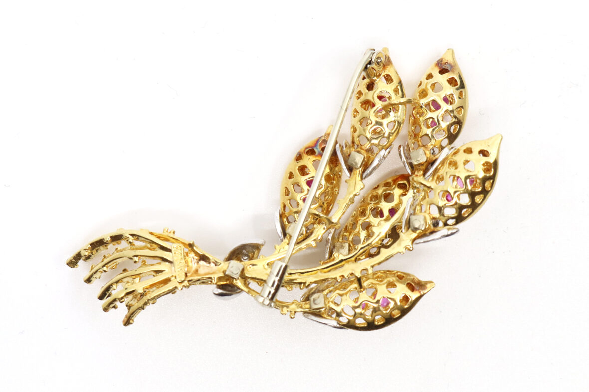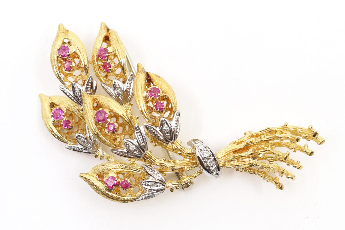 Broche fleurie en or jaune ornée de petites roses et de petits rubis.