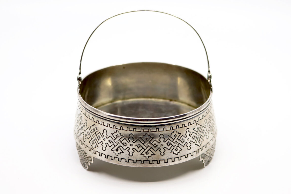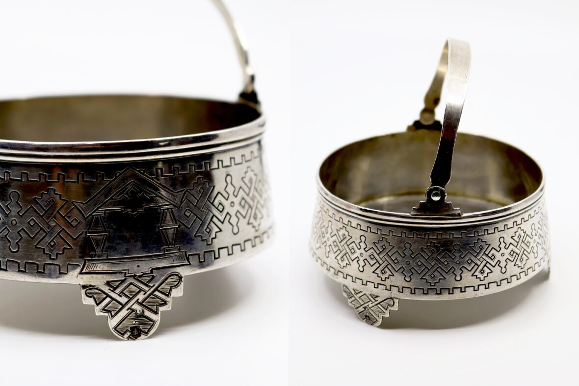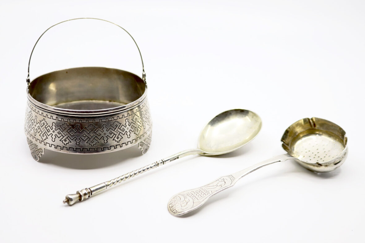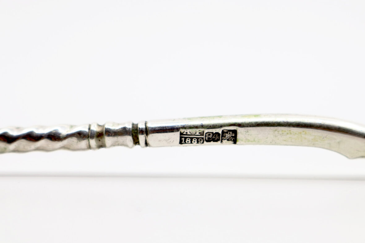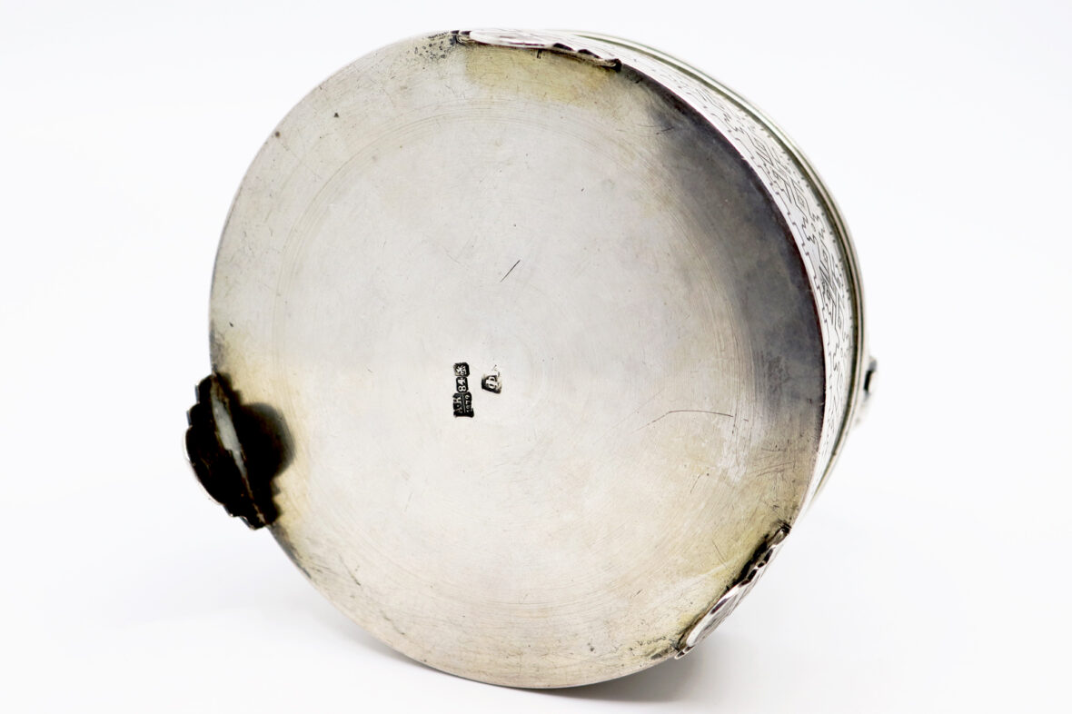– un sucrier posant sur trois pieds, une anse, à décor ciselé d’une frise géométrique architecturée. Poinçon A.R 1879.