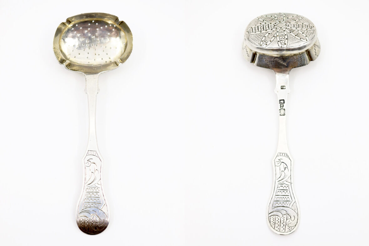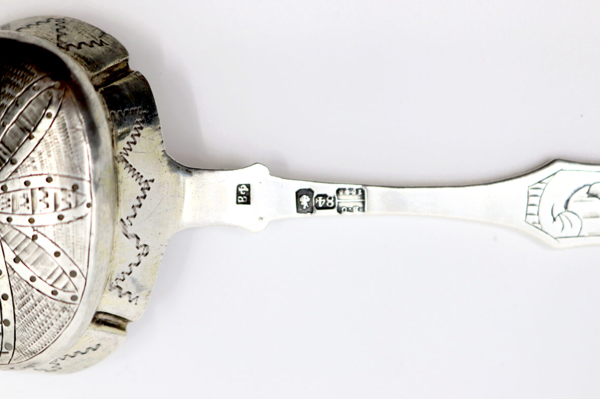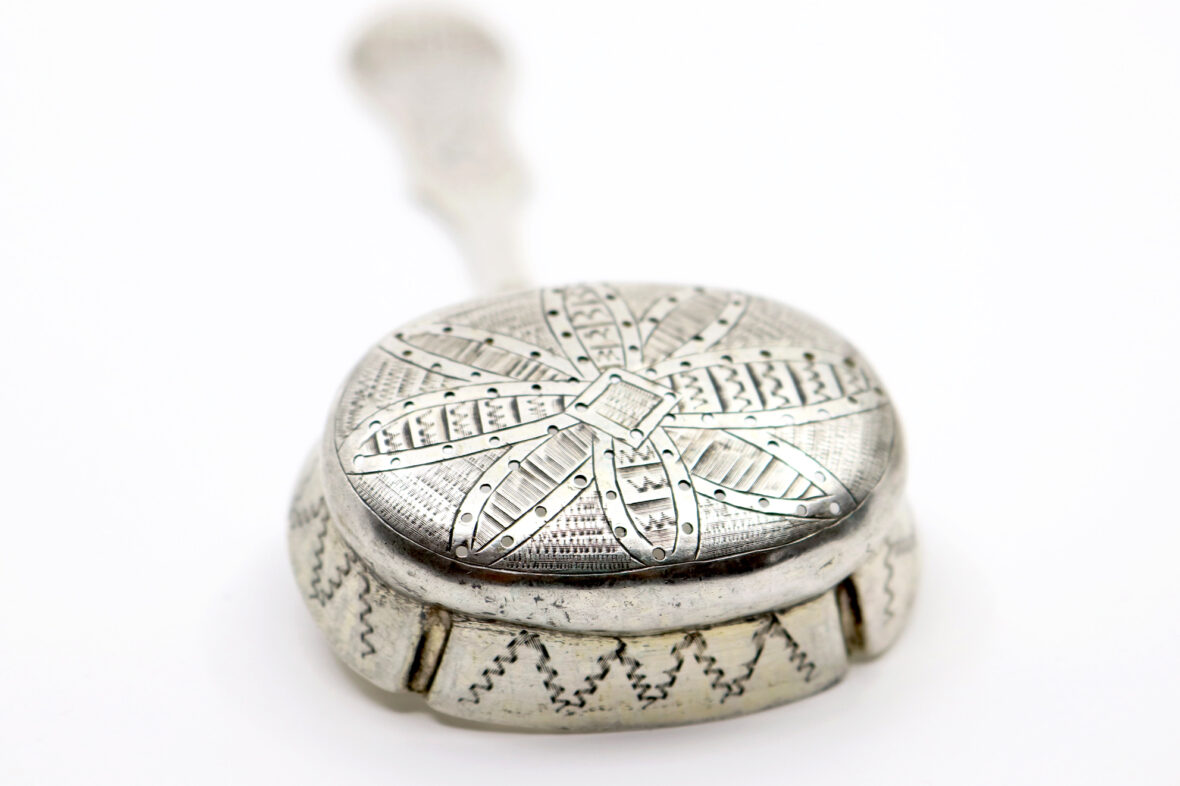 – une cuillère saupoudreuse à décor ciselé de feuillages stylisés et frises. Poinçon B.C. 18?