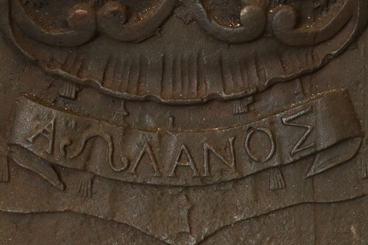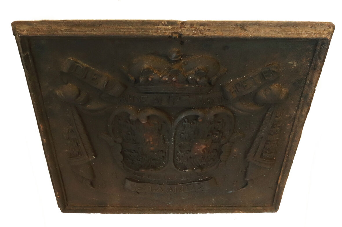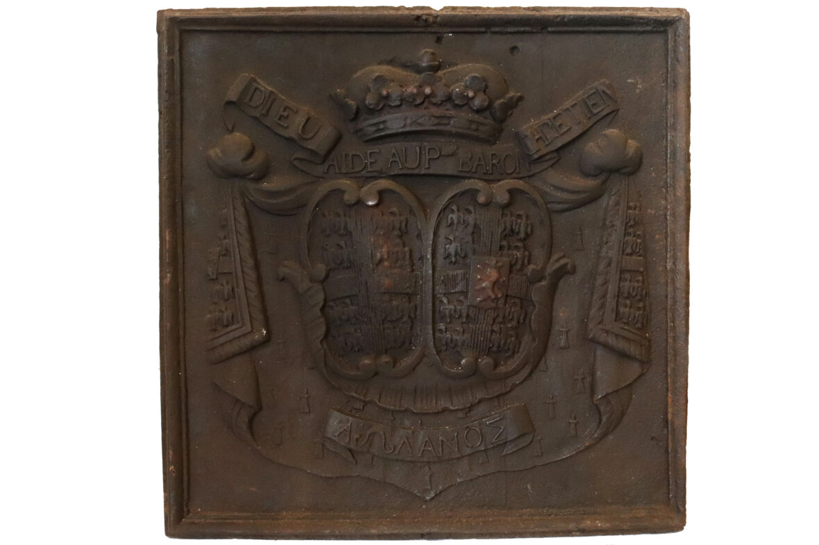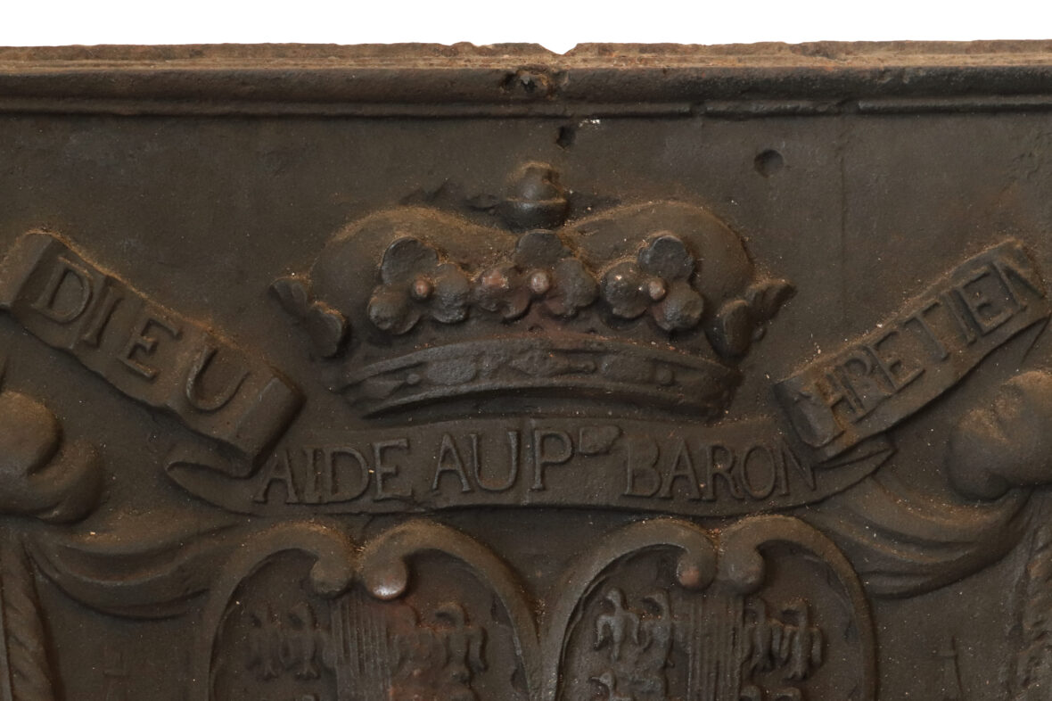 Très belle plaque de cheminée en fonte sculptée. Elle porte la devise de la maison des Montmorency « Dieu aide au premier baron chrétien » ainsi que leur blason une croix cantonnée de seize alérions d’azur.