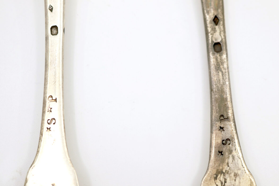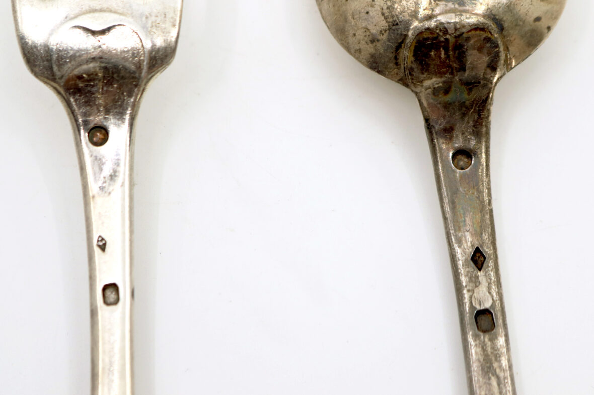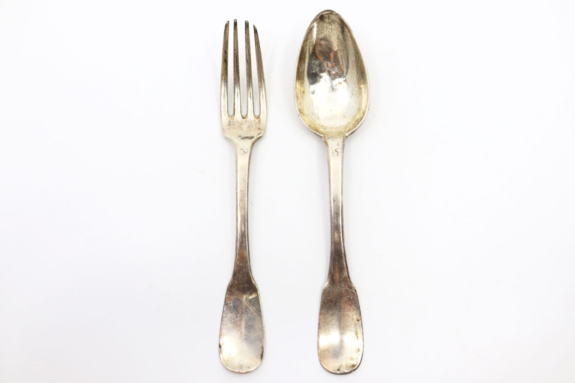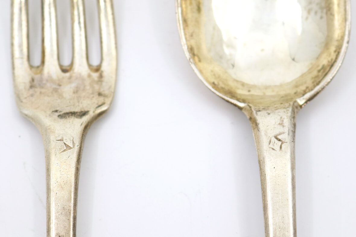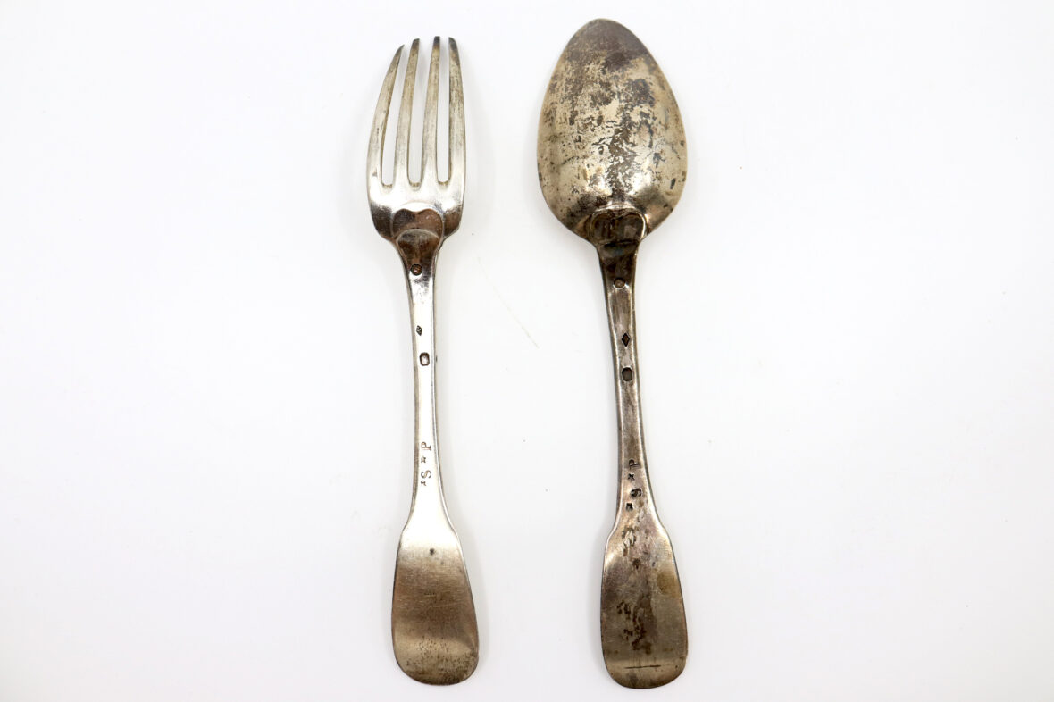 Un couvert en argent uniplat monogrammé S.P. Poinçon Vieillard. Poids : 128,5 g