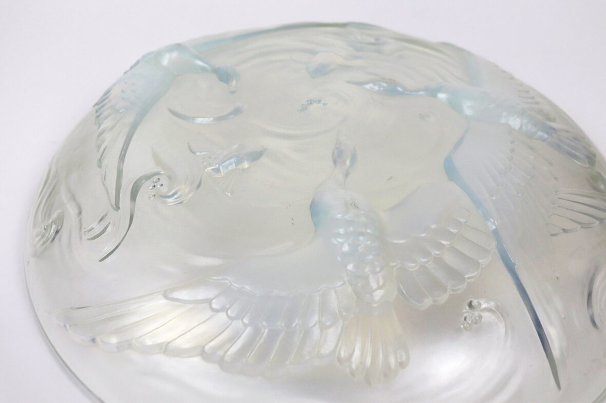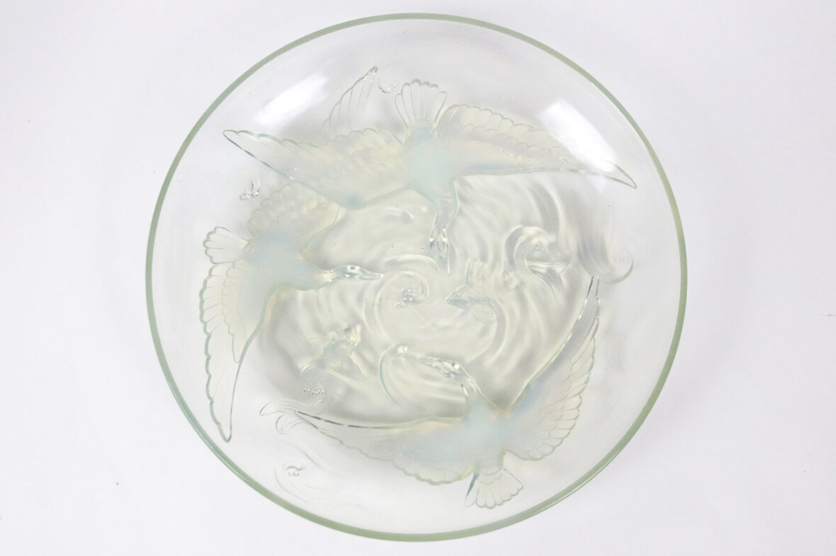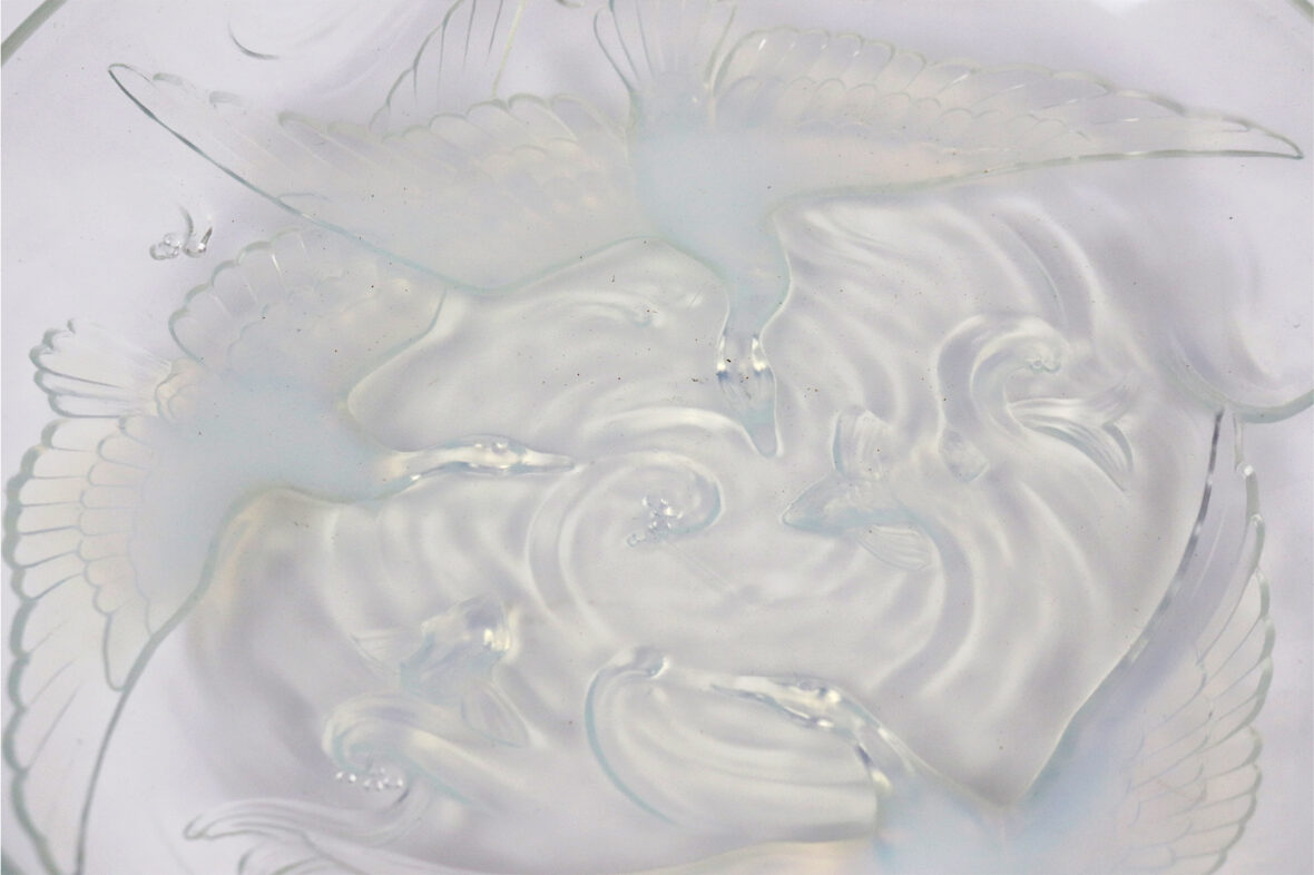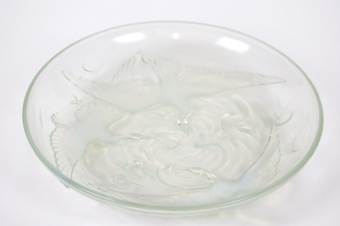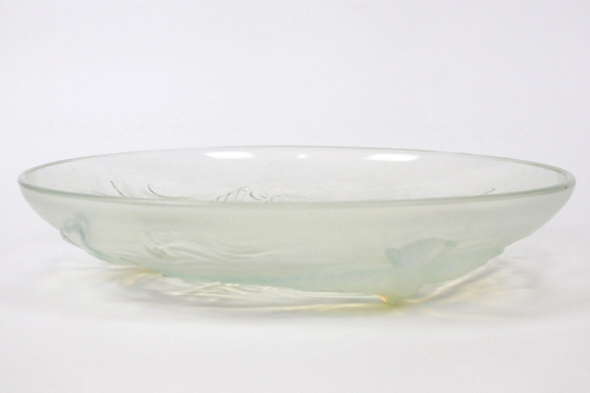 Plat rond en verre pressé moulé à décor irisé de trois cygnes et poissons.