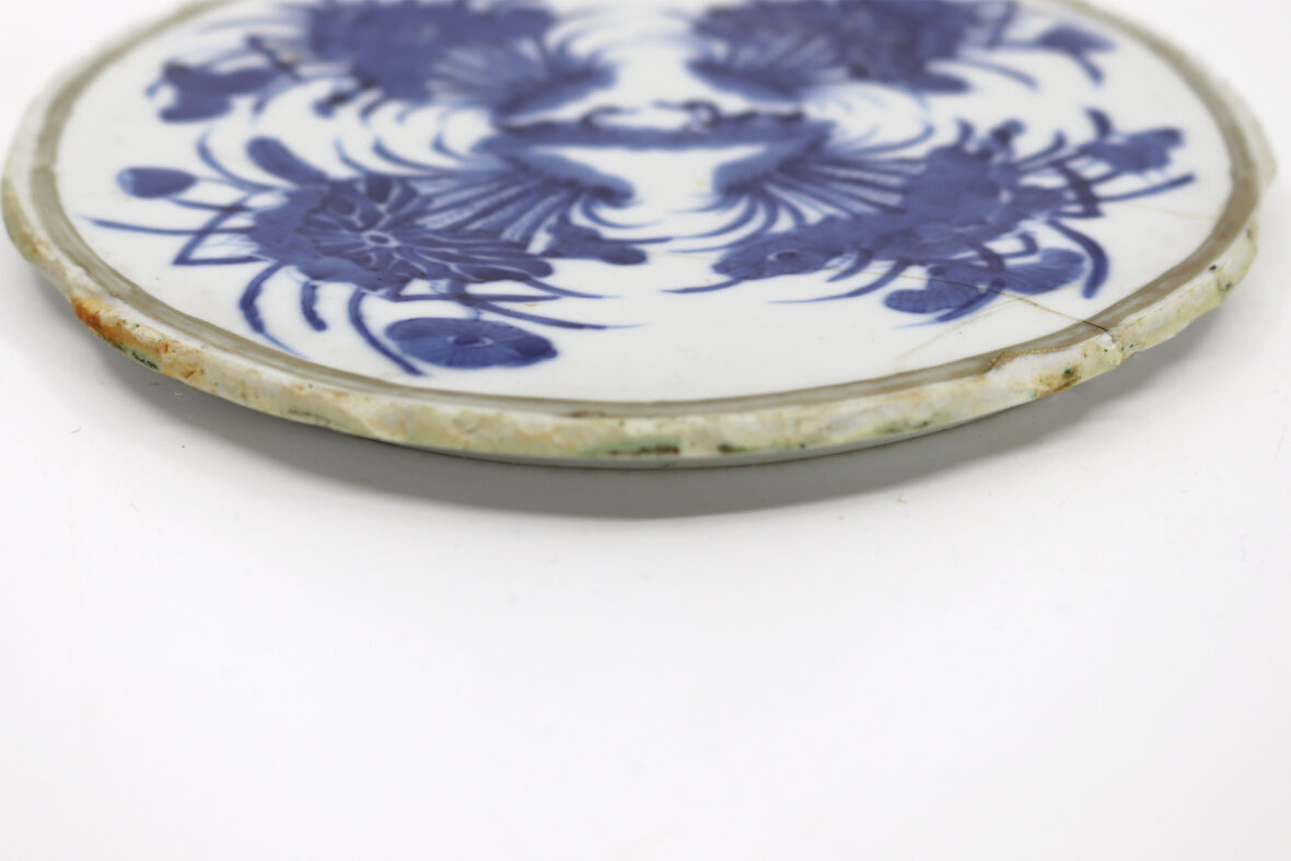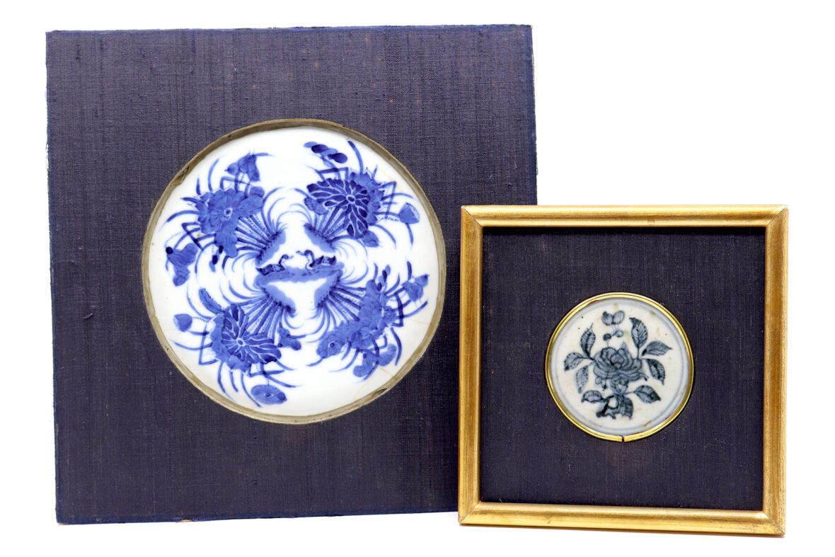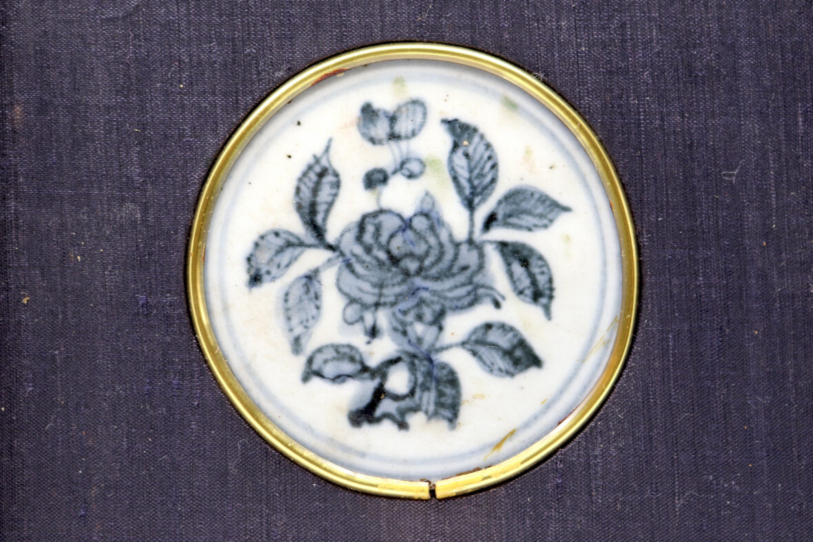 On y joint un petit médaillon en porcelaine blanc bleu à décor de rose, dans son encadrement.