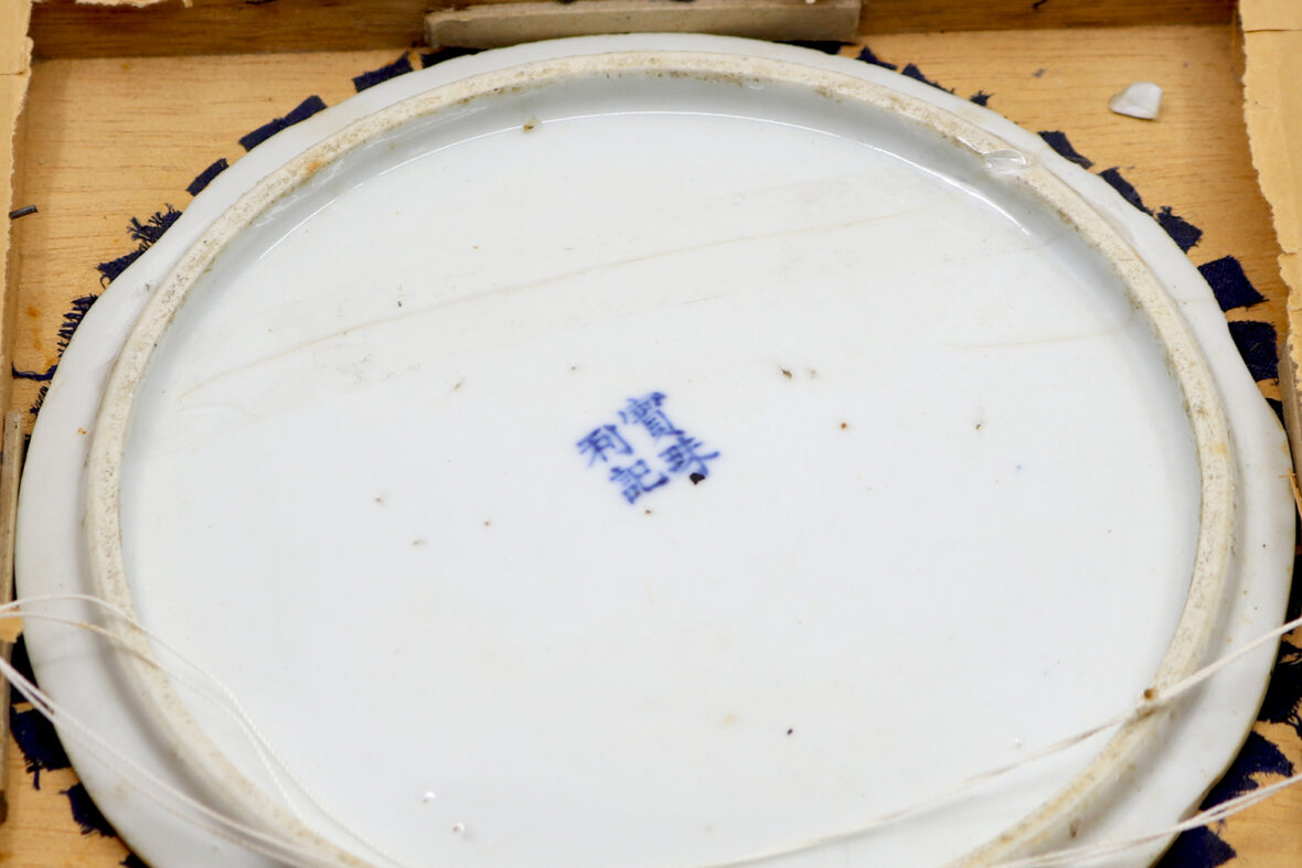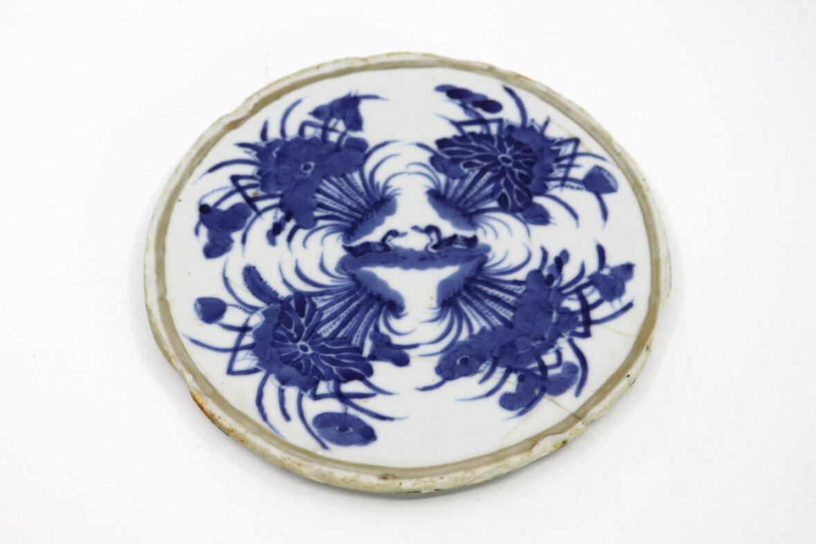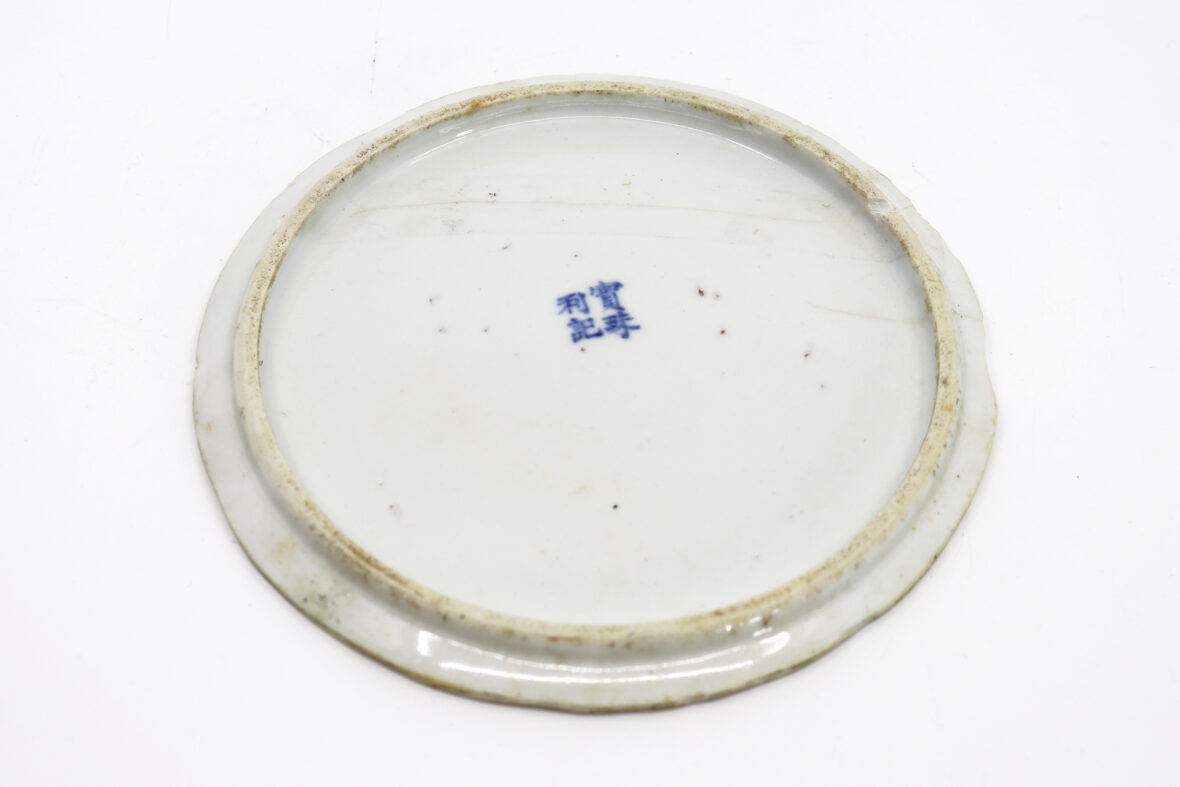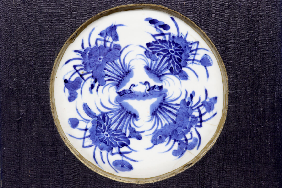 Assiette en procelaine blanc bleu à décor de deux canards affrontés au centre de motifs végétaux. Porte au revers la marque Buu Châu loi ky (fait selon les ordres de Baozhou).
