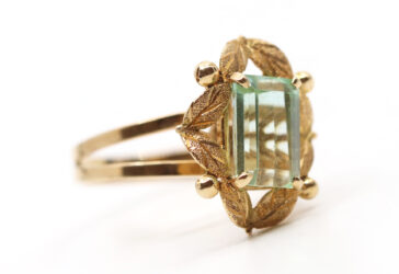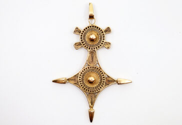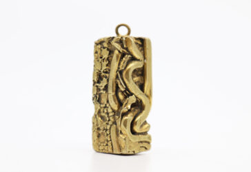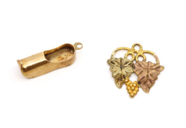 Broche stylisant une feuille en métal doré et noir.