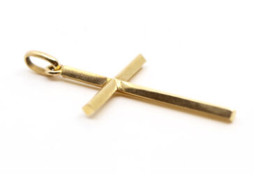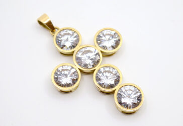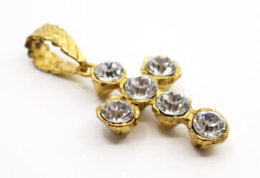 Christian LACROIX Pendentif croix en métal doré et strass. Signé. Long. : 5,8 cm