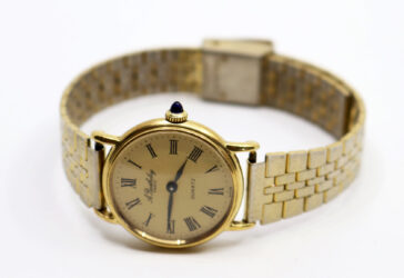 A. BERTHELAY Montre bracelet de dame en acier doré. Le boîtier rond à cadran doré…