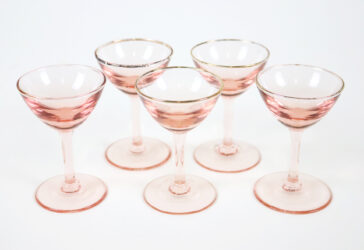 Partie de service à liqueur comprenant 5 petits verres sur piédouche en verre rose…