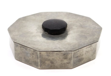 A. PETIT (XXe) Boîte couverte à pans en étain à décor martelé, la prise en bois.