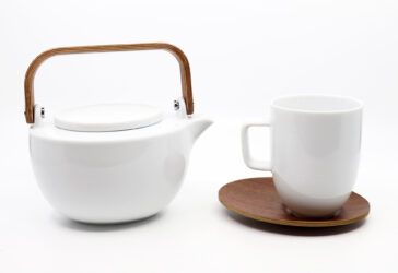 ASA SELECTION Théière en porcelaine et anse en bois et sa tasse sur coupelle en bois.
