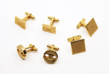 Ensemble de trois paires de boutons de manchettes en métal plaqué or à motifs guillochés.