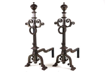 Importante paire de chenêts en fer forgé à décor d’enroulements et sommés de vases…