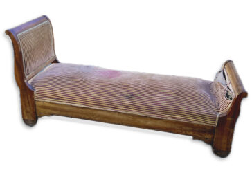 Lit de repos en bois à dossier renversé. Garniture de tissu rayé. XIXe. Haut. : 89…