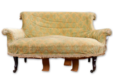 Petit canapé crapaud en bois noirci et garniture de velours. Piètement sur roulettes….